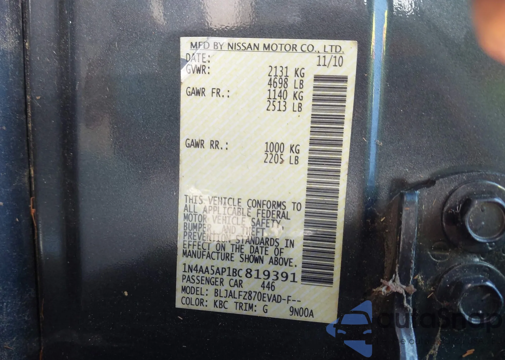 • VIN: 1N4AA5AP1BC819391
