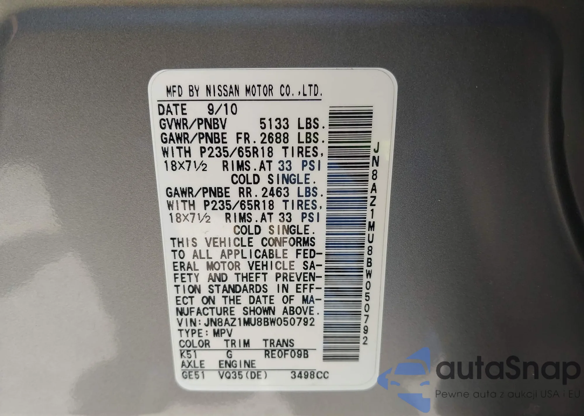 VIN: JN8AZ1MU8BW050792