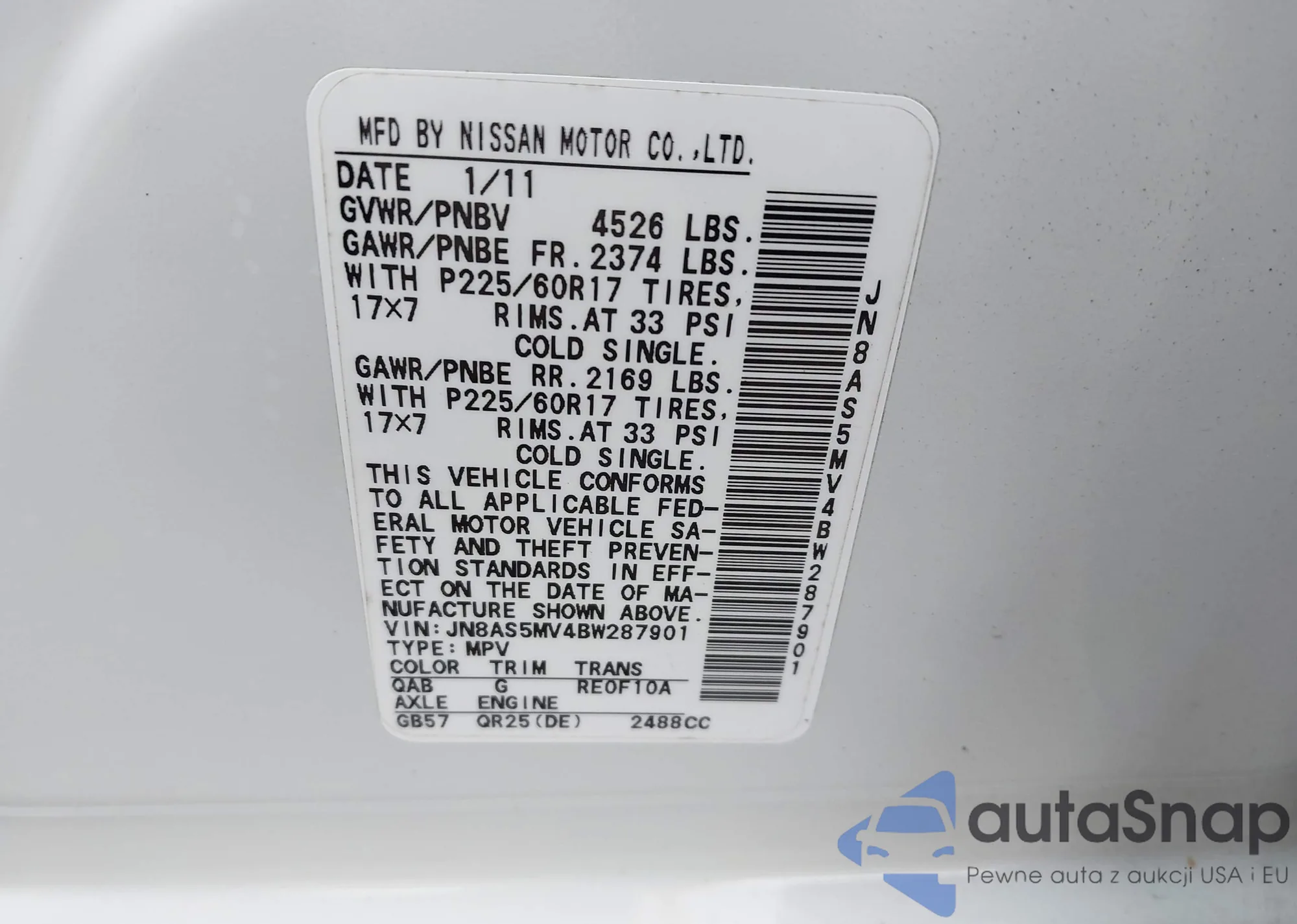 • VIN: JN8AS5MV4BW287901