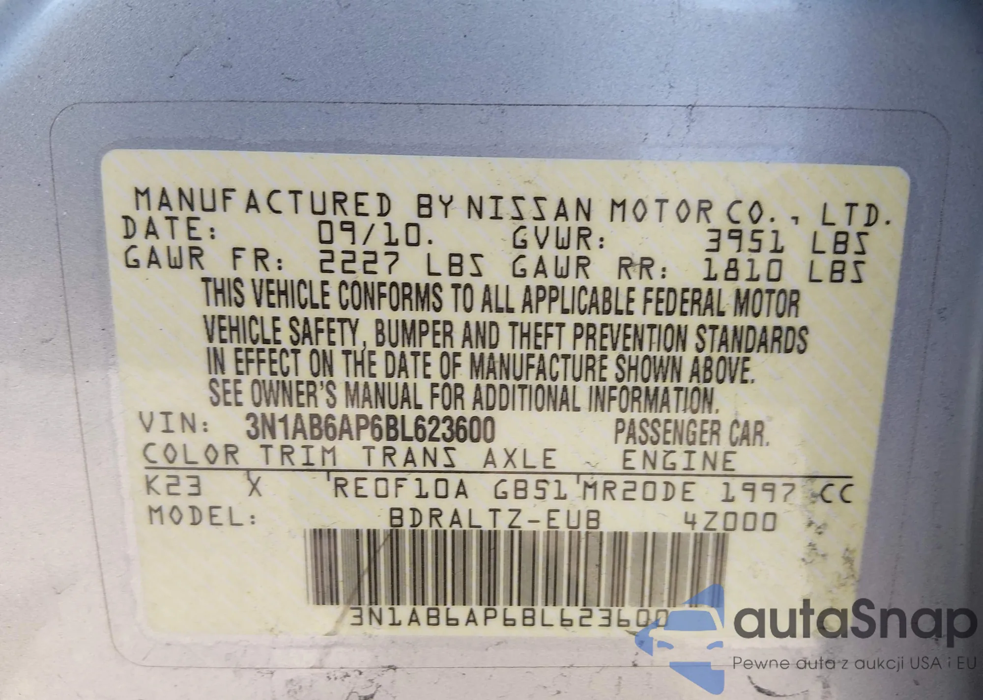 The car Nissan Sentra 2011 (VIN 3N1AB6AP6BL623600) has not been auctioned before. The documents are clean, and the mileage matches or is below the market average. Sold by an insurance company – we recommend purchase. Delivery to the port will take approx. 6–8 weeks.