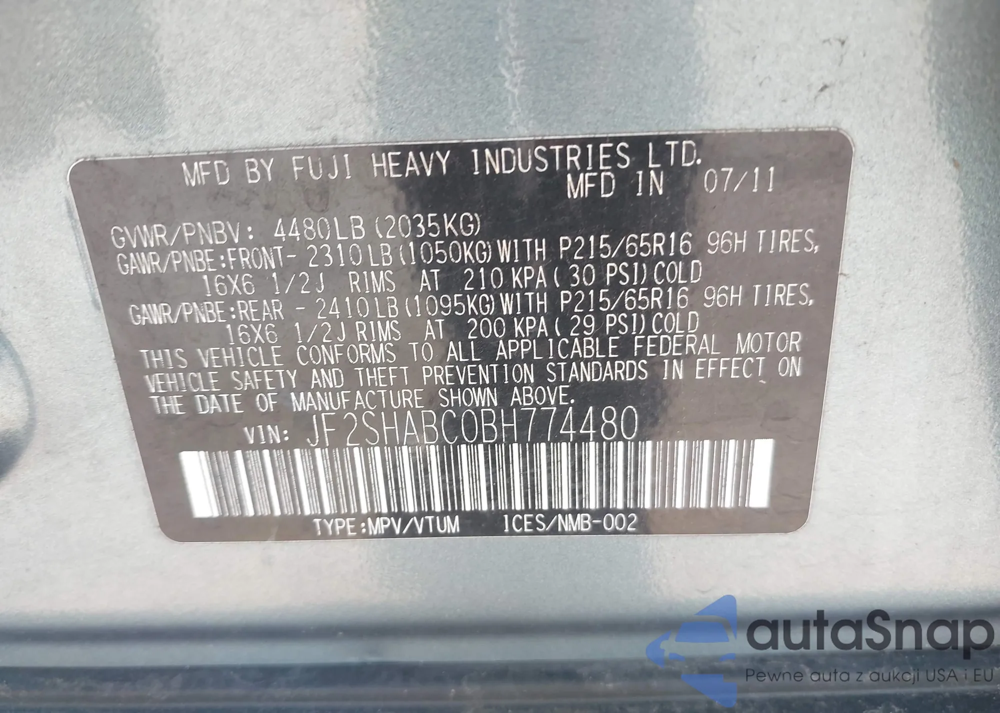 VIN: JF2SHABC0BH774480