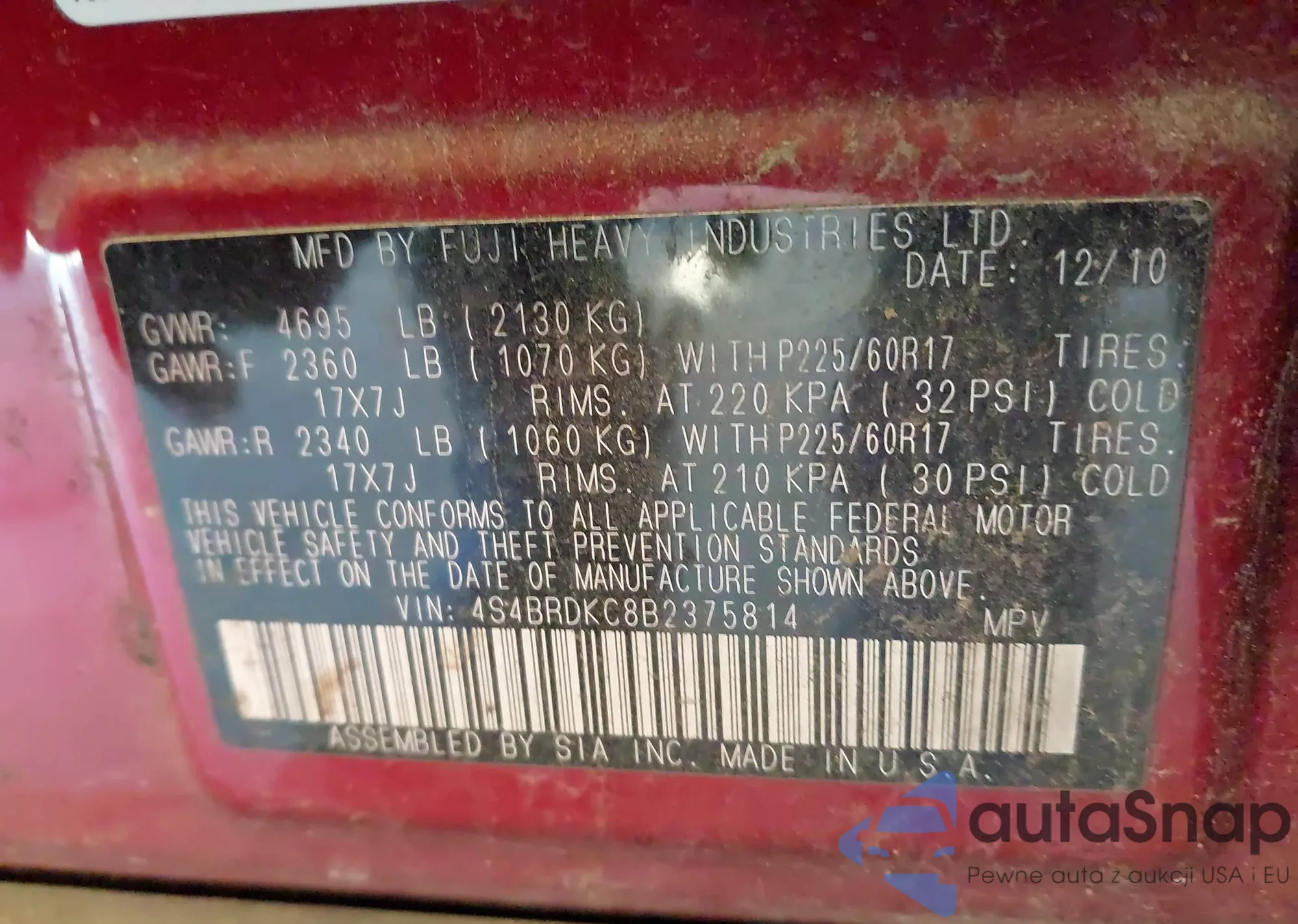 The car Subaru Outback 2011 (VIN 4S4BRDKC8B2375814) has not been auctioned before. The documents are clean, and the mileage matches or is below the market average. Sold by an insurance company – we recommend purchase. Delivery to the port will take approx. 6–8 weeks.