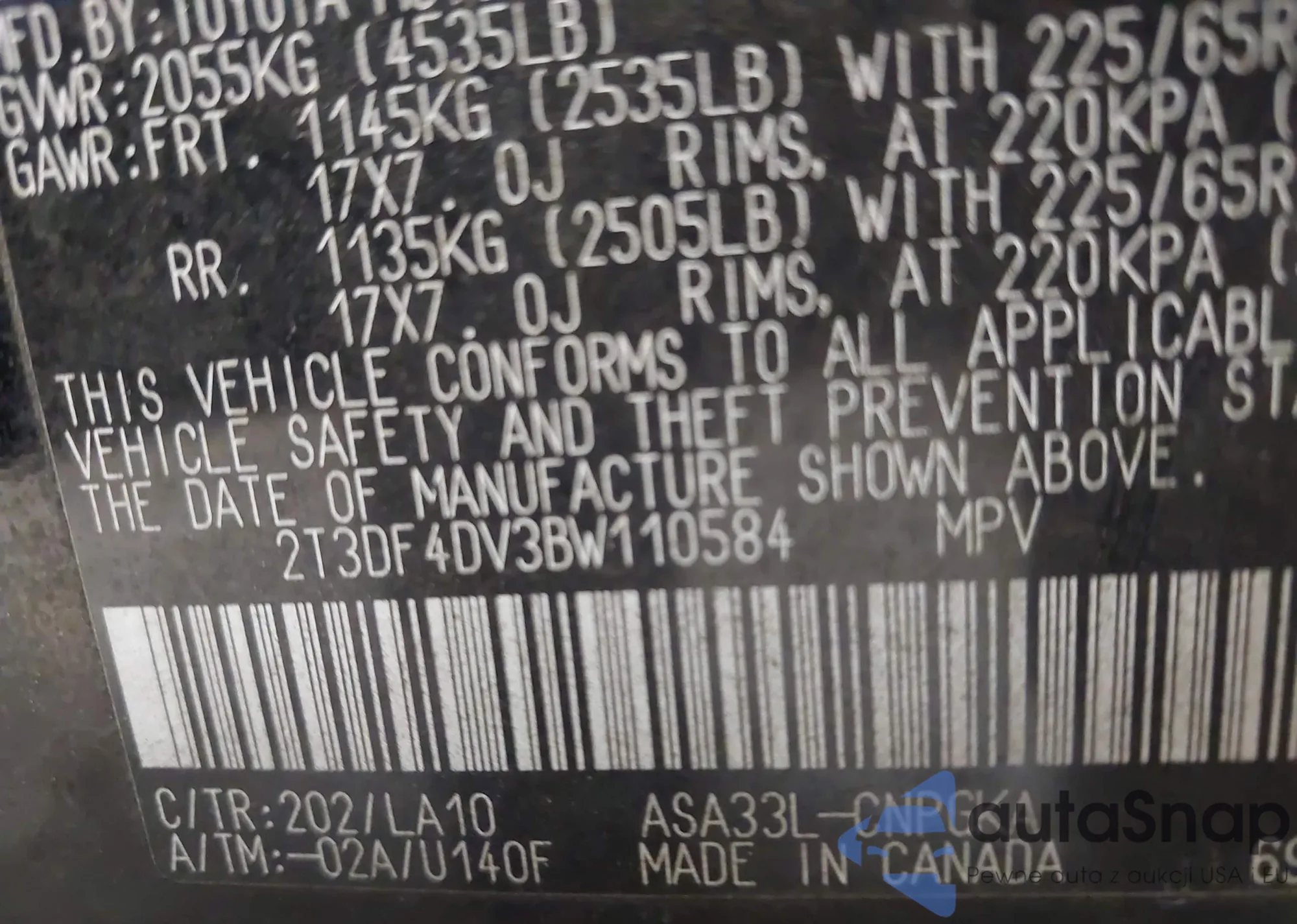 The car Toyota RAV 4 2011 (VIN 2T3DF4DV3BW110584) has not been auctioned before. The documents are clean, and the mileage matches or is below the market average. Sold by an insurance company – we recommend purchase. Delivery to the port will take approx. 6–8 weeks.