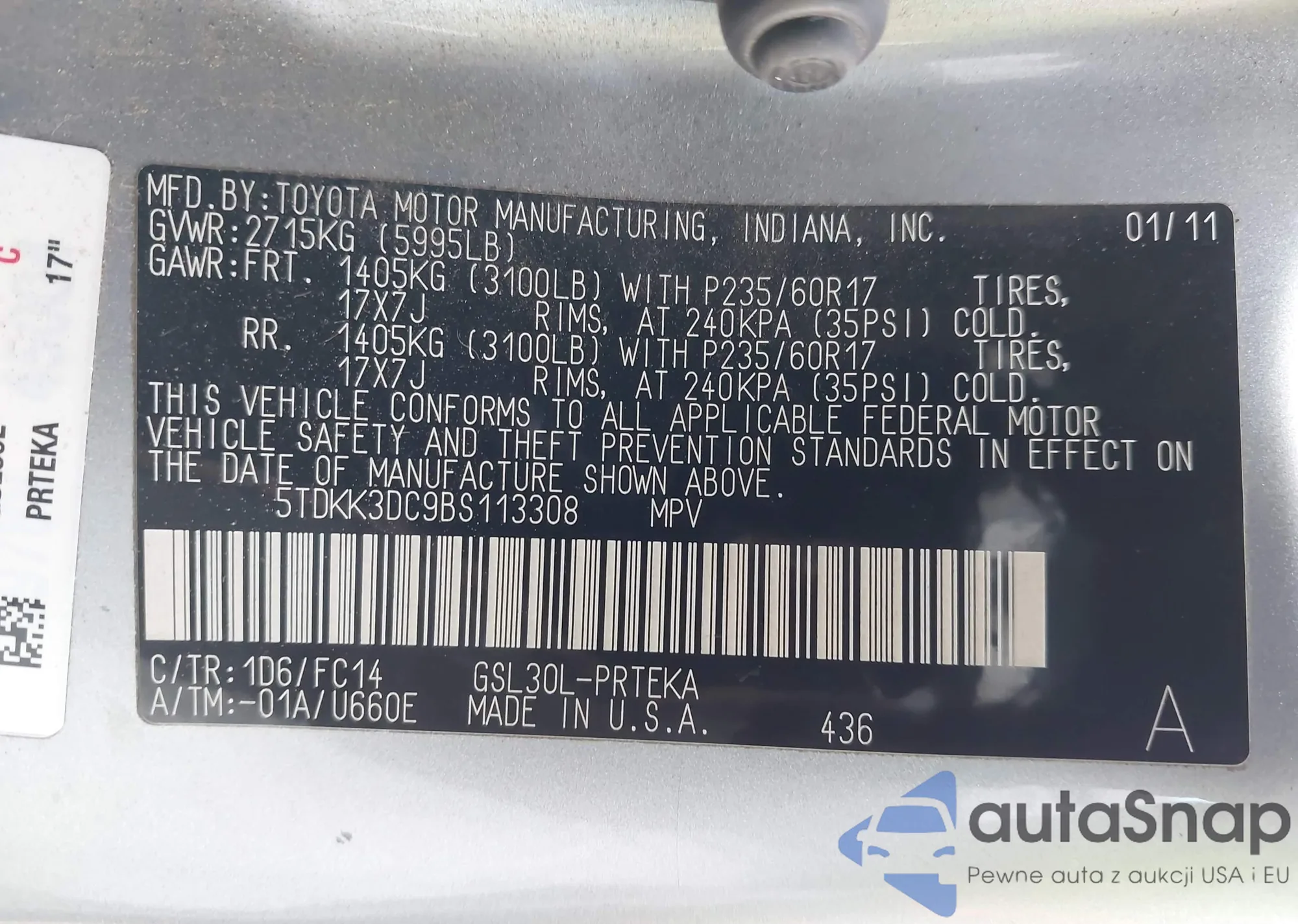 The car Toyota Sienna 2011 (VIN 5TDKK3DC9BS113308) is sold by an unverified seller. We recommend checking the Carfax report and confirming registration possibilities before purchase.
