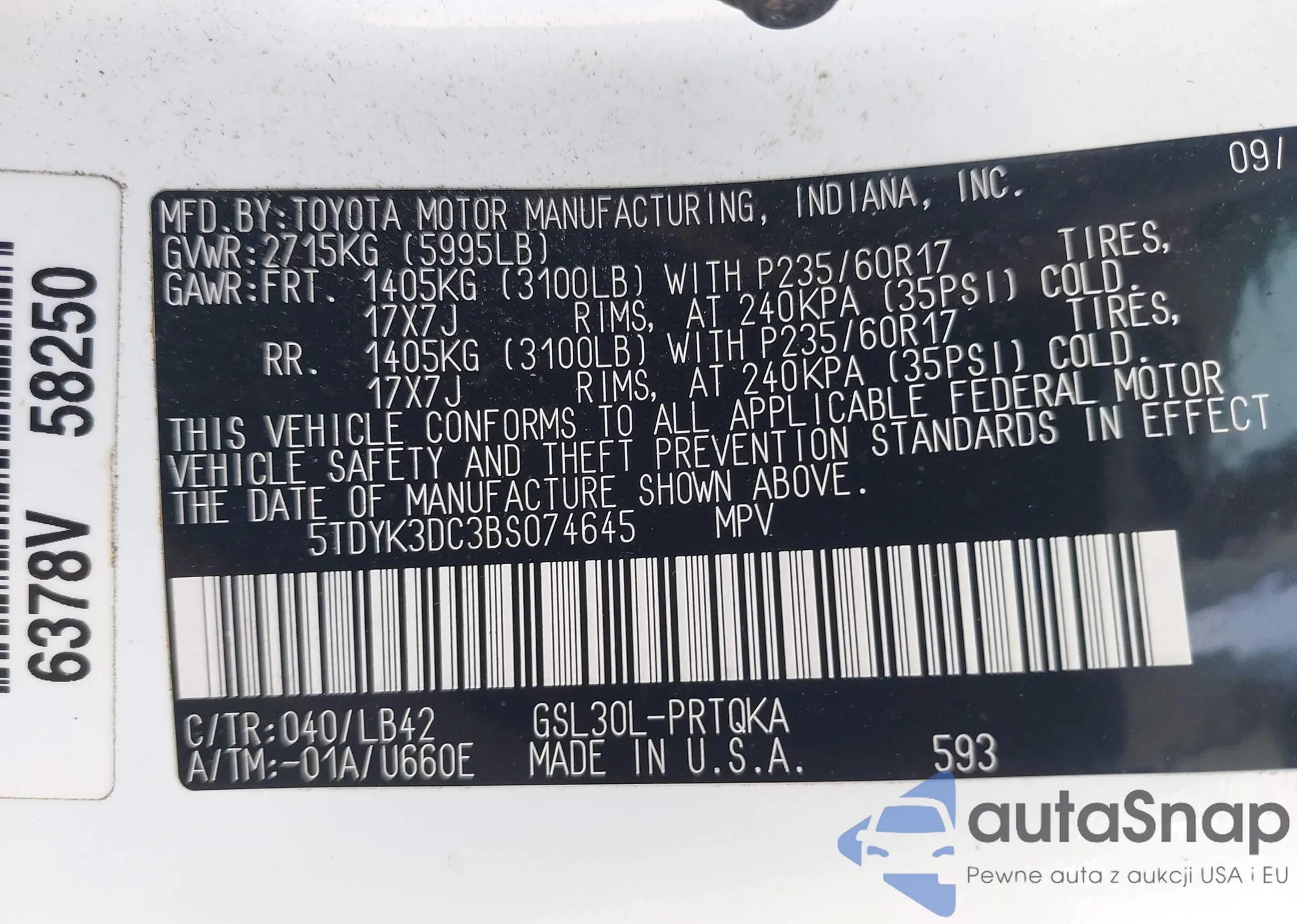 The car Toyota Sienna 2011 (VIN 5TDYK3DC3BS074645) has not been auctioned before. The documents are clean, and the mileage matches or is below the market average. Sold by an insurance company – we recommend purchase. Delivery to the port will take approx. 6–8 weeks.