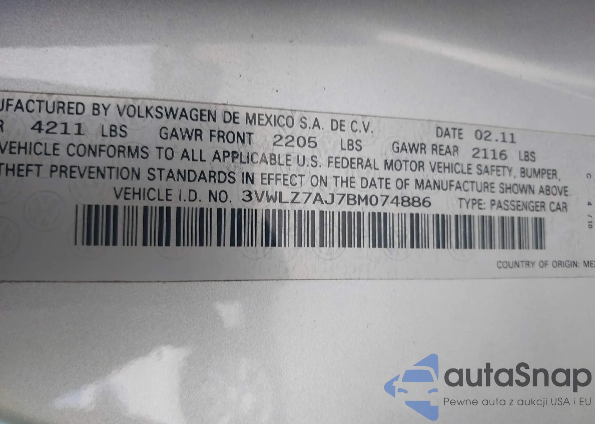 VIN: 3VWLZ7AJ7BM074886