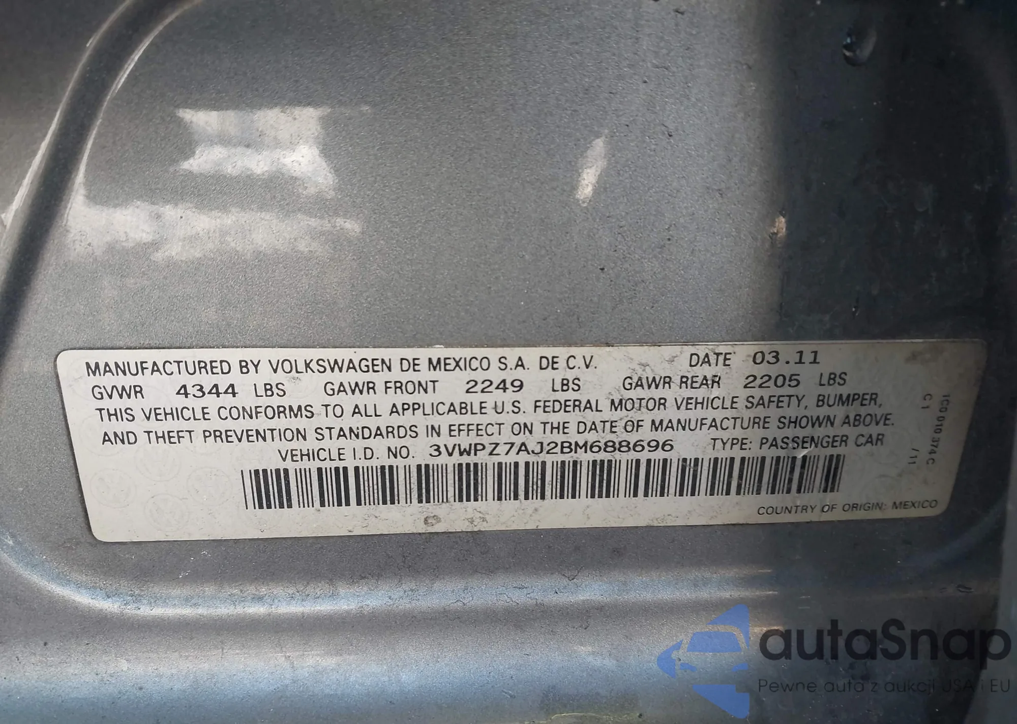 The car Volkswagen Jetta 2011 (VIN 3VWPZ7AJ2BM688696) has not been auctioned before. The documents are clean, and the mileage matches or is below the market average. Sold by an insurance company – we recommend purchase. Delivery to the port will take approx. 6–8 weeks.