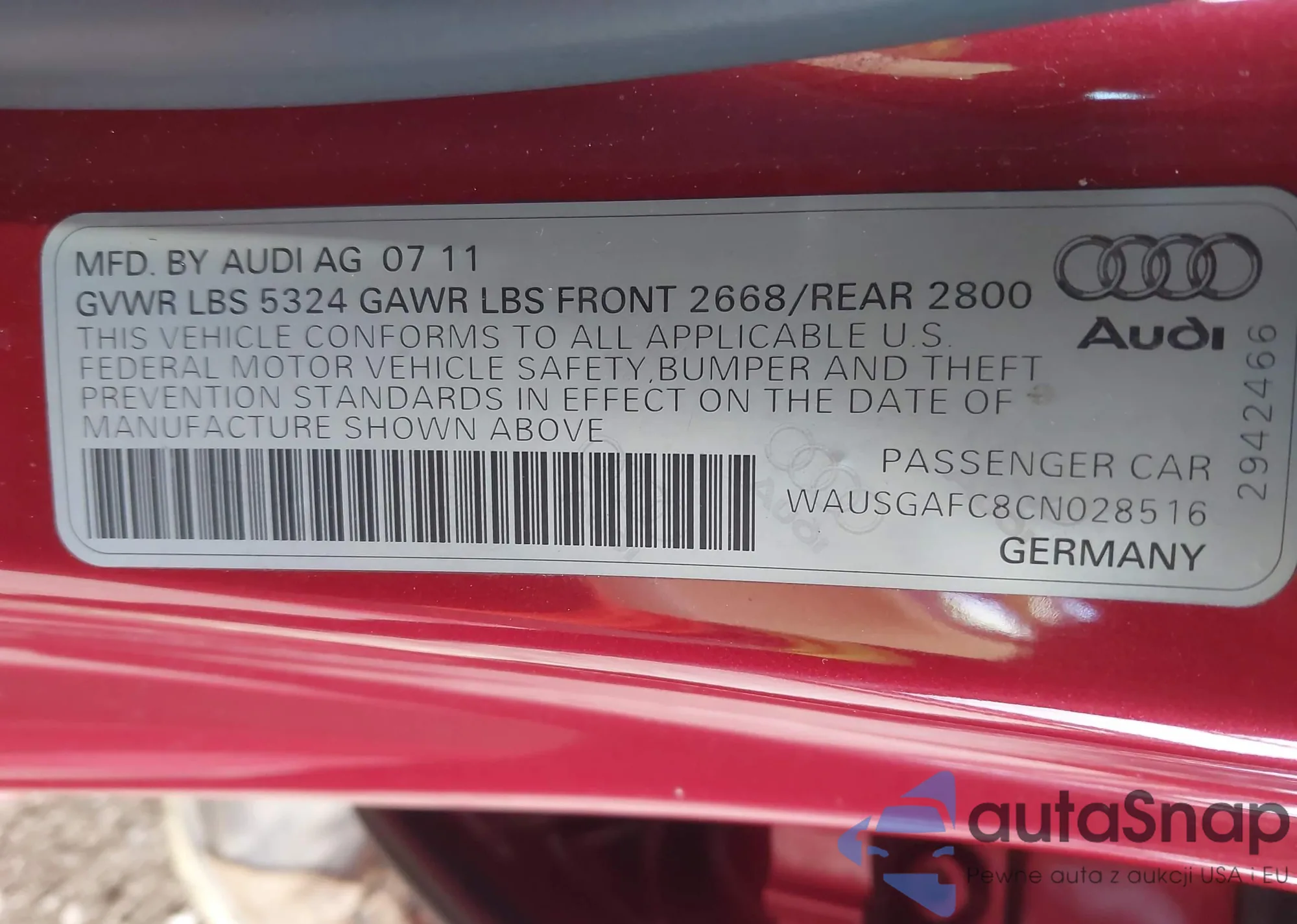 • VIN: WAUSGAFC8CN028516