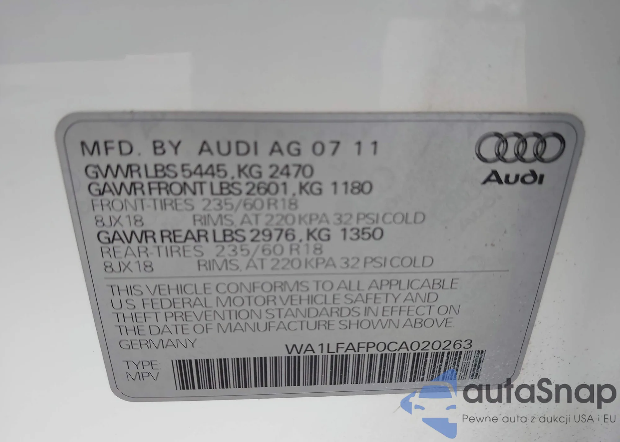 The car Audi Q5 2012 (VIN WA1LFAFP0CA020263) has not been auctioned before. The documents are clean, and the mileage matches or is below the market average. Sold by an insurance company – we recommend purchase. Delivery to the port will take approx. 6–8 weeks.