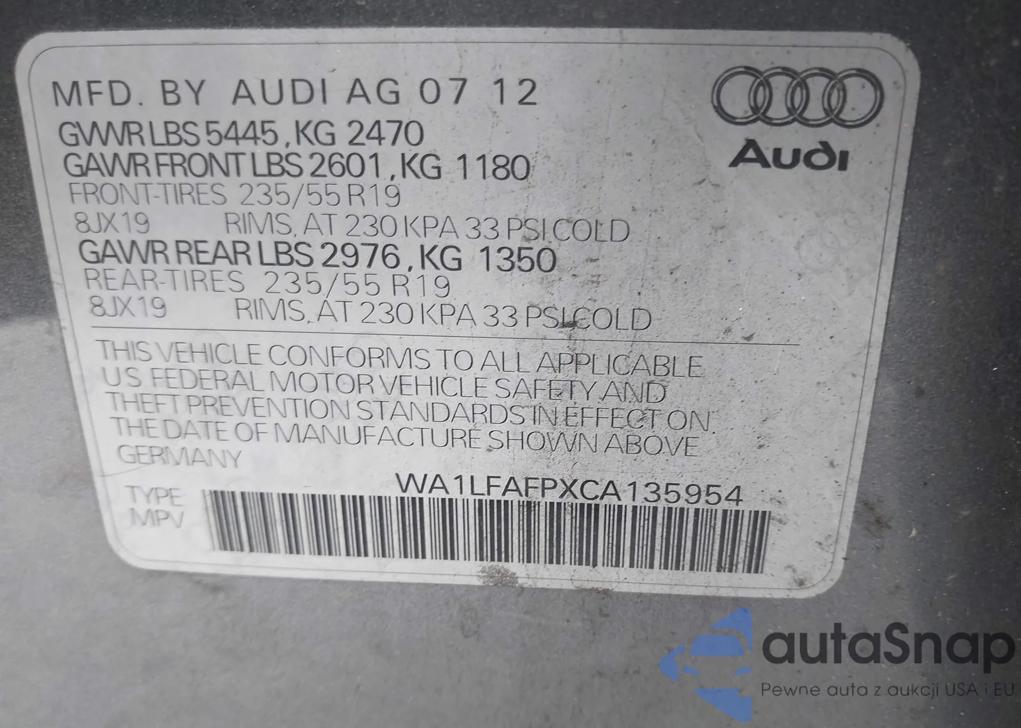 • VIN: WA1LFAFPXCA135954