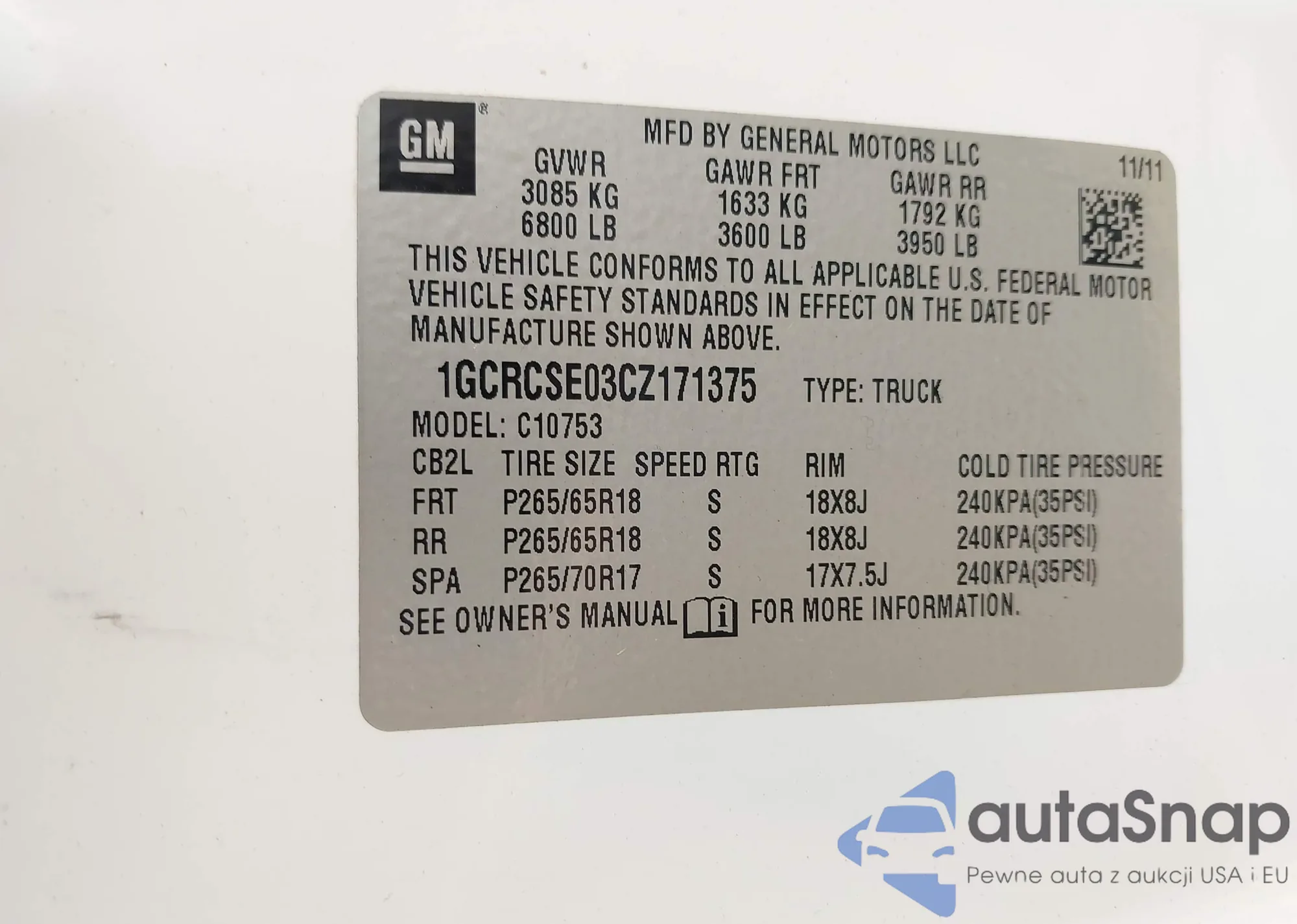 • VIN: 1GCRCSE03CZ171375