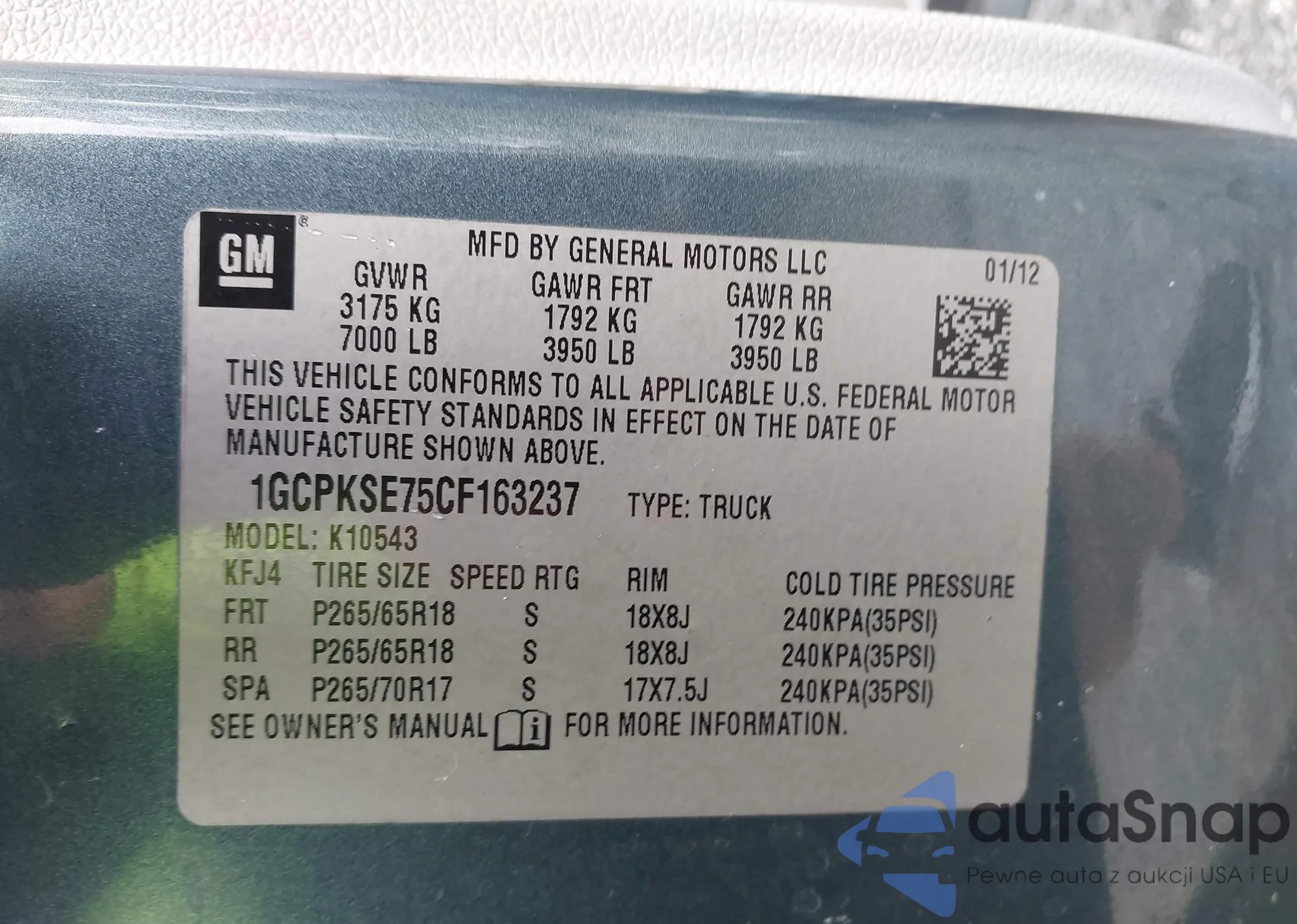 VIN: 1GCPKSE75CF163237