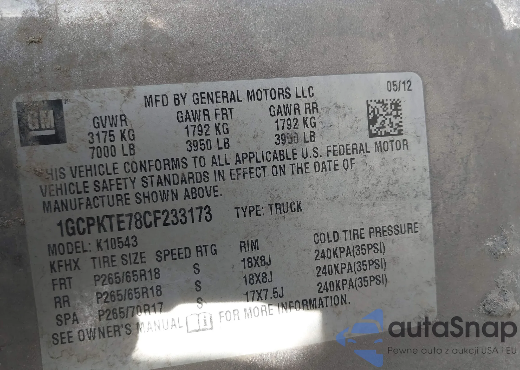 VIN: 1GCPKTE78CF233173