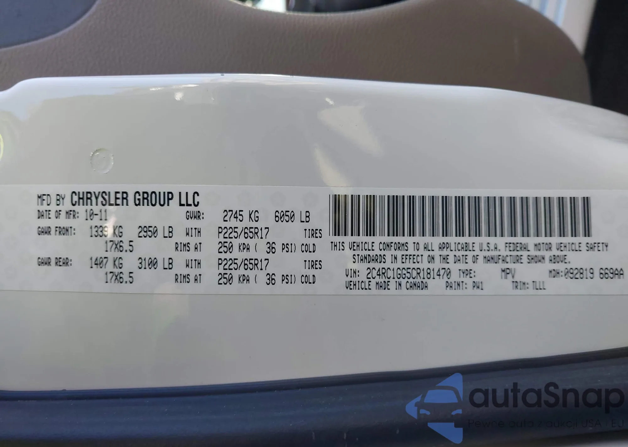 The car Chrysler Town & Country 2012 (VIN 2C4RC1GG5CR181470) has not been auctioned before. The documents are clean, and the mileage matches or is below the market average. Sold by an insurance company – we recommend purchase. Delivery to the port will take approx. 6–8 weeks.