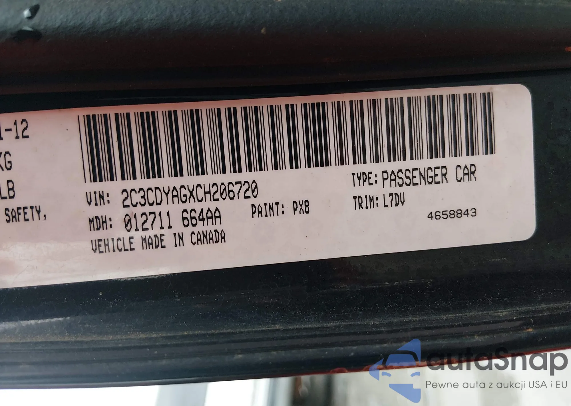 The car Dodge Challenger 2012 (VIN 2C3CDYAGXCH206720) has not been auctioned before. The documents are clean, and the mileage matches or is below the market average. Sold by an insurance company – we recommend purchase. Delivery to the port will take approx. 6–8 weeks.