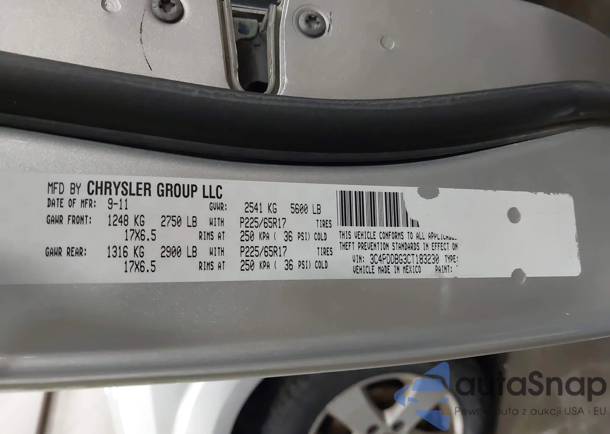 The car Dodge Journey 2012 (VIN 3C4PDDBG3CT183230) has not been auctioned before. The documents are clean, and the mileage matches or is below the market average. Sold by an insurance company – we recommend purchase. Delivery to the port will take approx. 6–8 weeks.