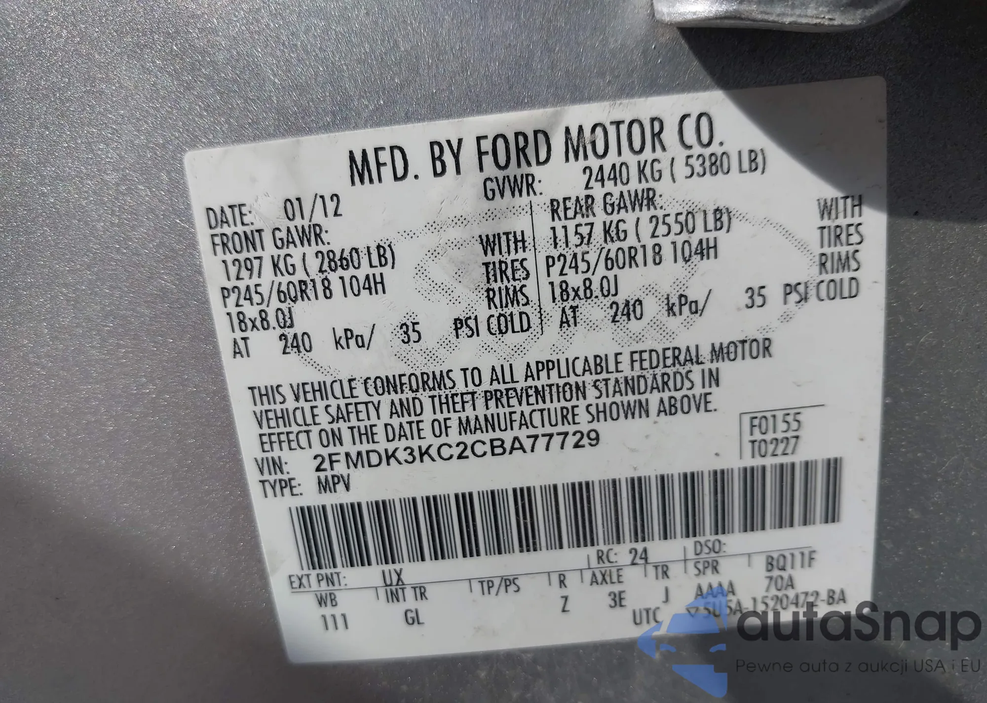 VIN: 2FMDK3KC2CBA77729