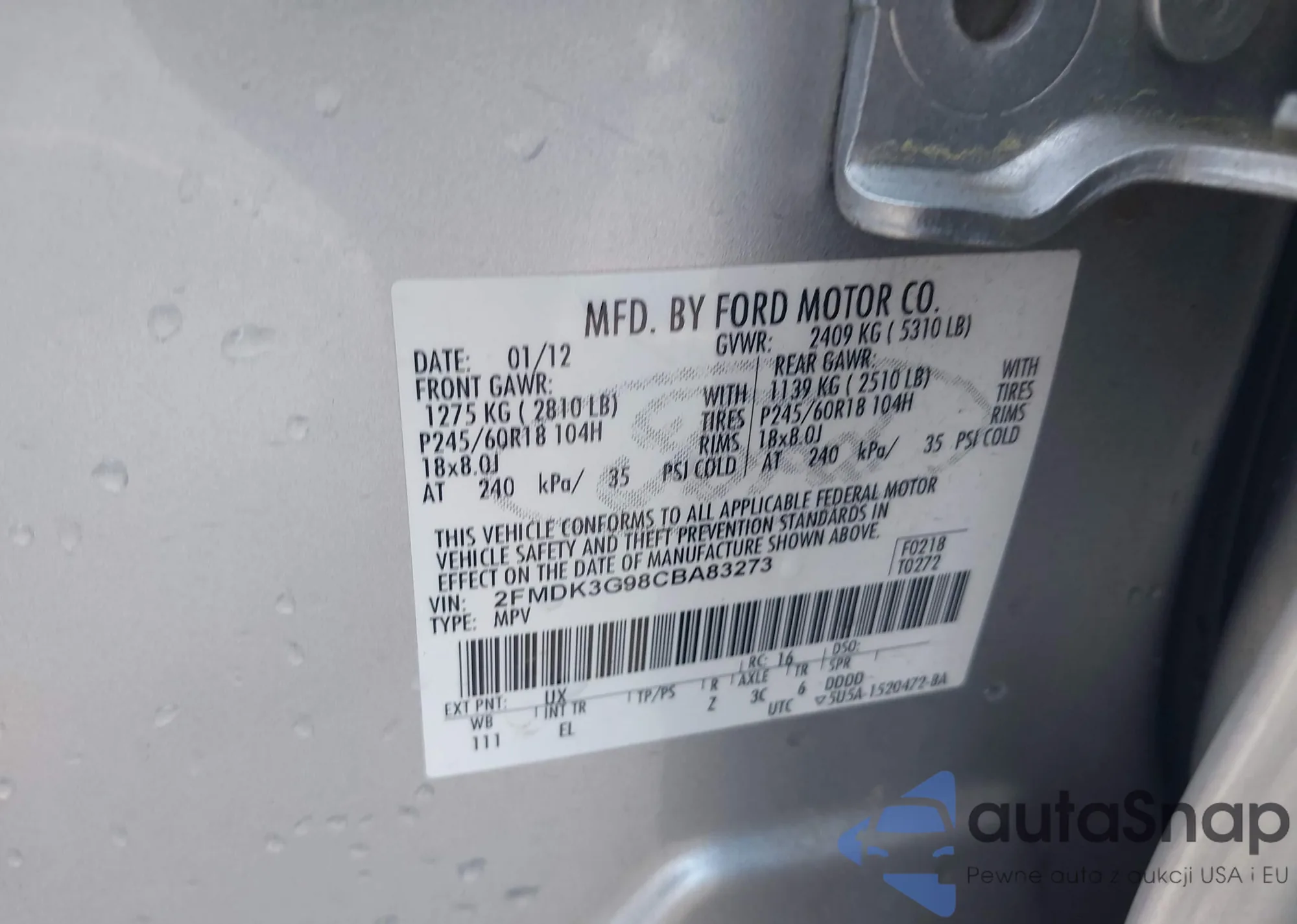 • VIN: 2FMDK3G98CBA83273