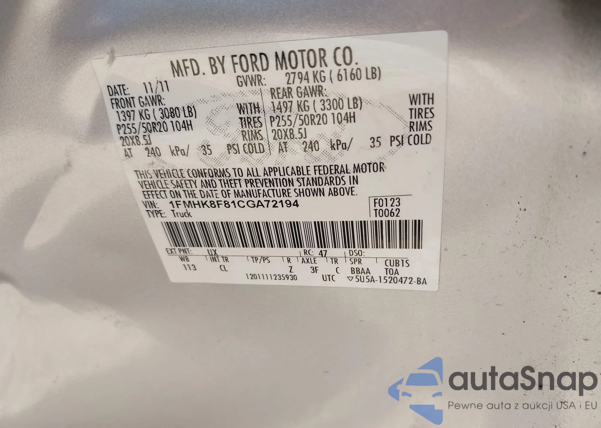 VIN: 1FMHK8F81CGA72194