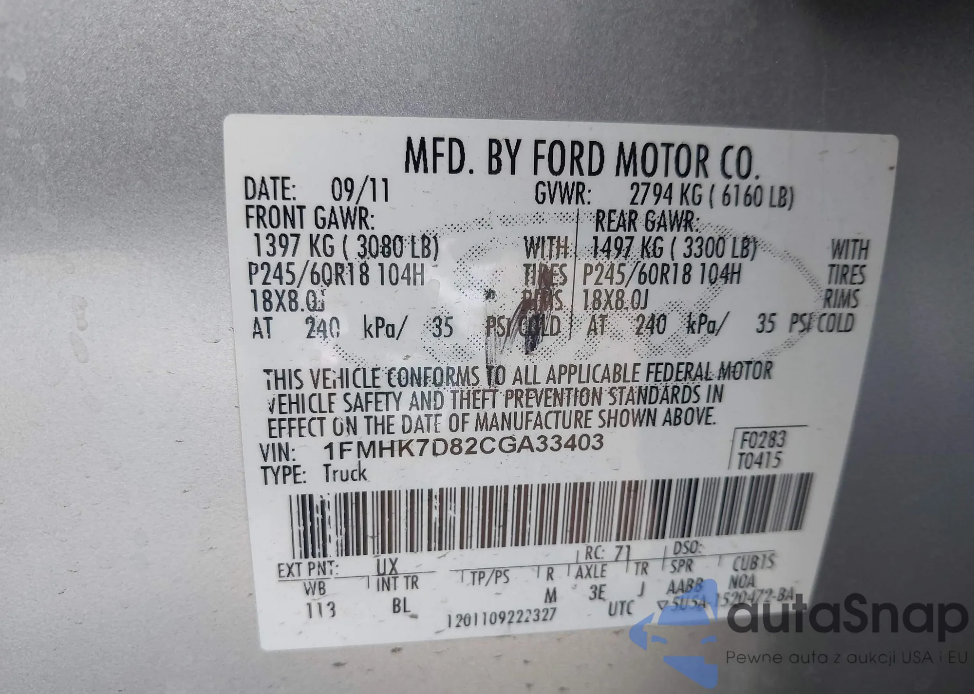 The car Ford Explorer 2012 (VIN 1FMHK7D82CGA33403) has not been auctioned before. The documents are clean, and the mileage matches or is below the market average. Sold by an insurance company – we recommend purchase. Delivery to the port will take approx. 6–8 weeks.