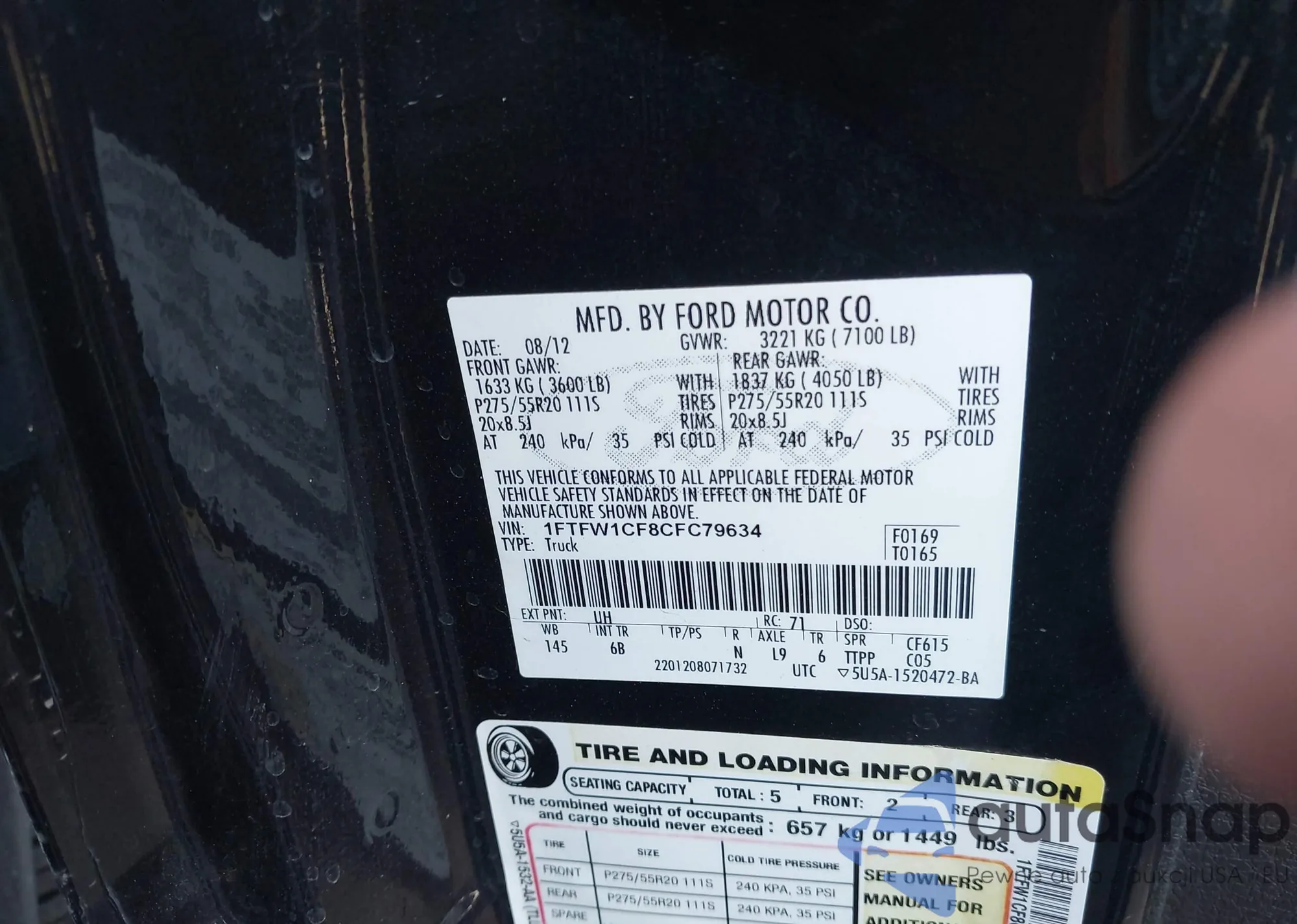 The car Ford F-150 2012 (VIN 1FTFW1CF8CFC79634) has not been auctioned before. The documents are clean, and the mileage matches or is below the market average. Sold by an insurance company – we recommend purchase. Delivery to the port will take approx. 6–8 weeks.