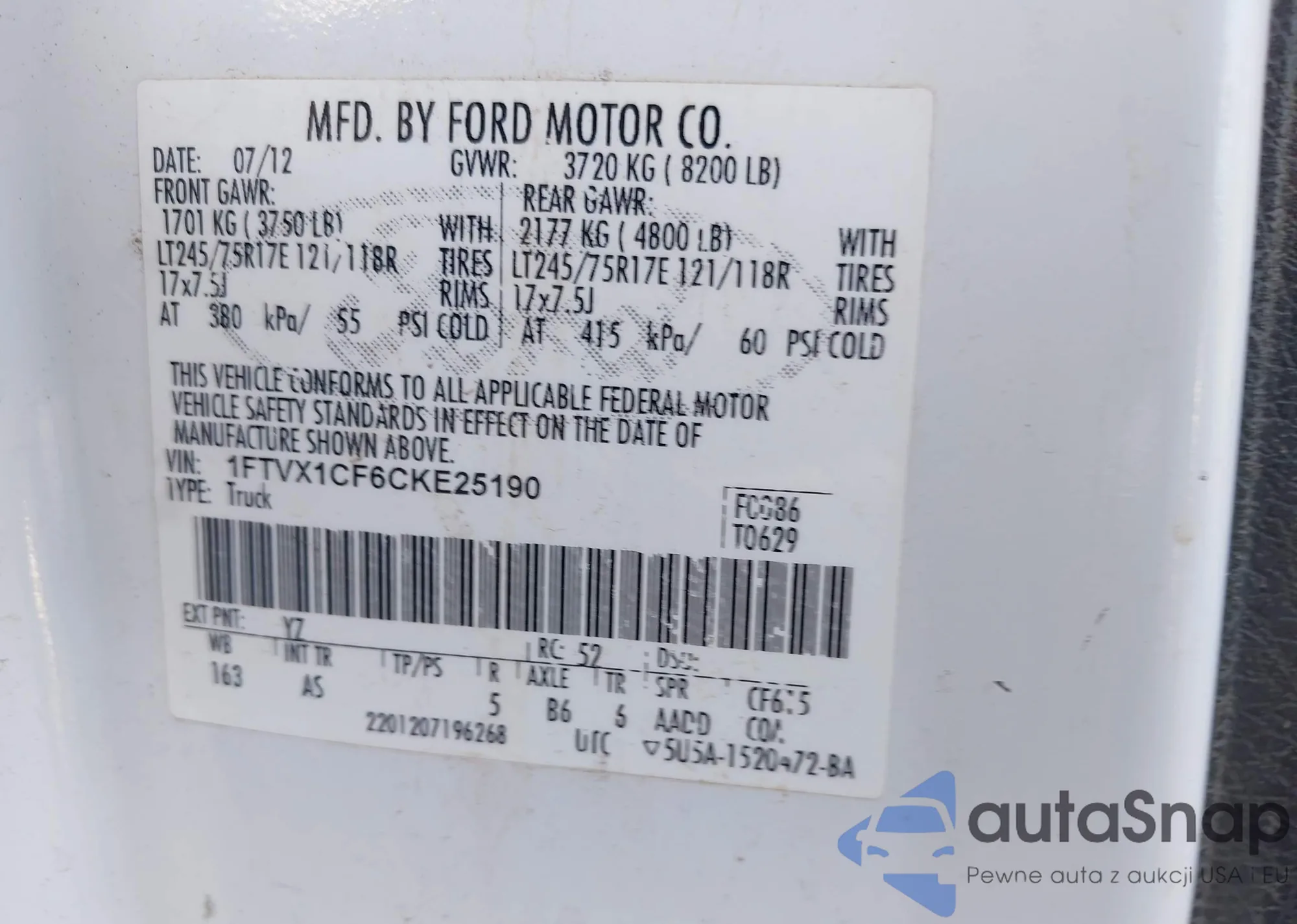 The car Ford F-150 2012 (VIN 1FTVX1CF6CKE25190) has not been auctioned before. The documents are clean, and the mileage matches or is below the market average. Sold by an insurance company – we recommend purchase. Delivery to the port will take approx. 6–8 weeks.