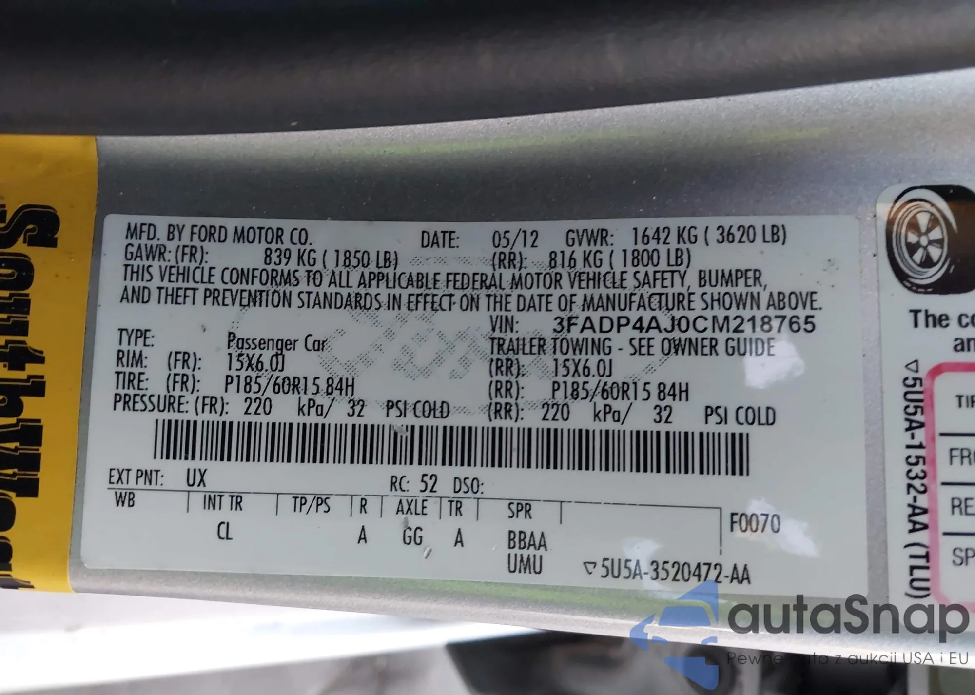 The car Ford Fiesta 2012 (VIN 3FADP4AJ0CM218765) has not been auctioned before. The documents are clean, and the mileage matches or is below the market average. Sold by an insurance company – we recommend purchase. Delivery to the port will take approx. 6–8 weeks.