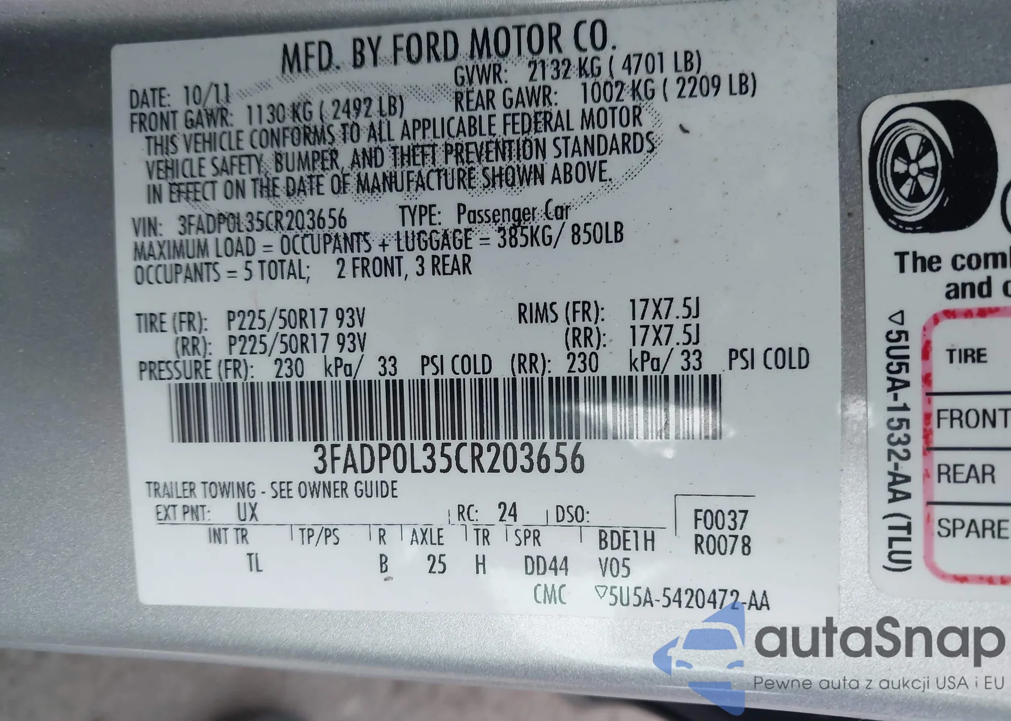 VIN: 3FADP0L35CR203656