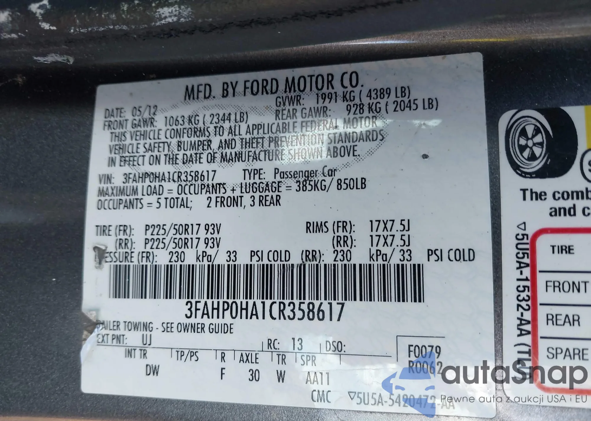 VIN: 3FAHP0HA1CR358617