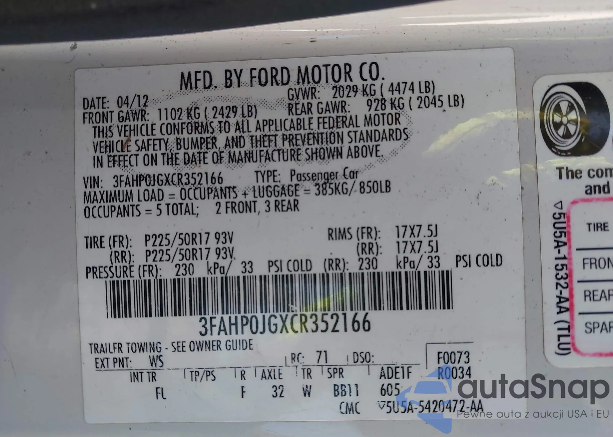 VIN: 3FAHP0JGXCR352166