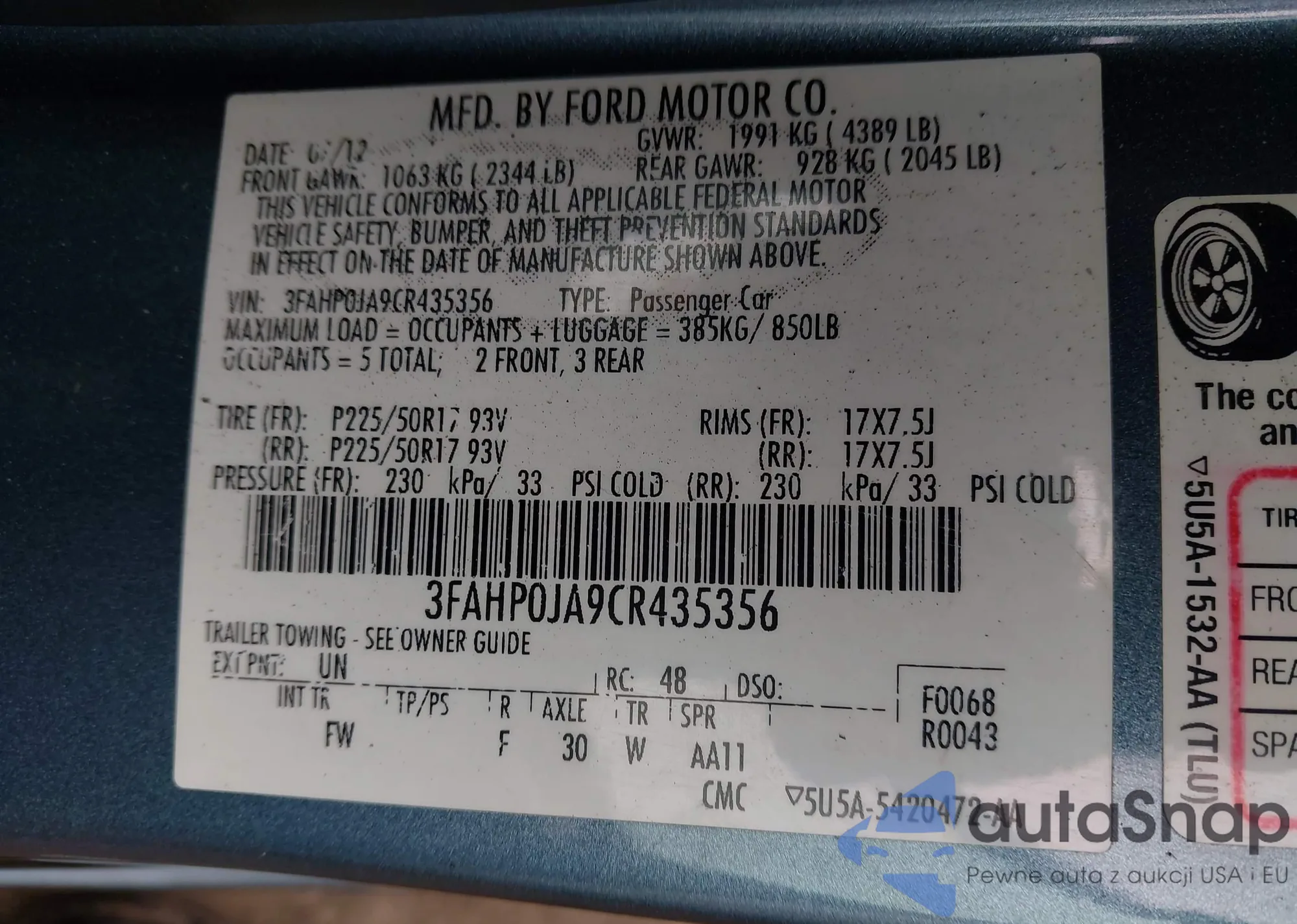 VIN: 3FAHP0JA9CR435356
