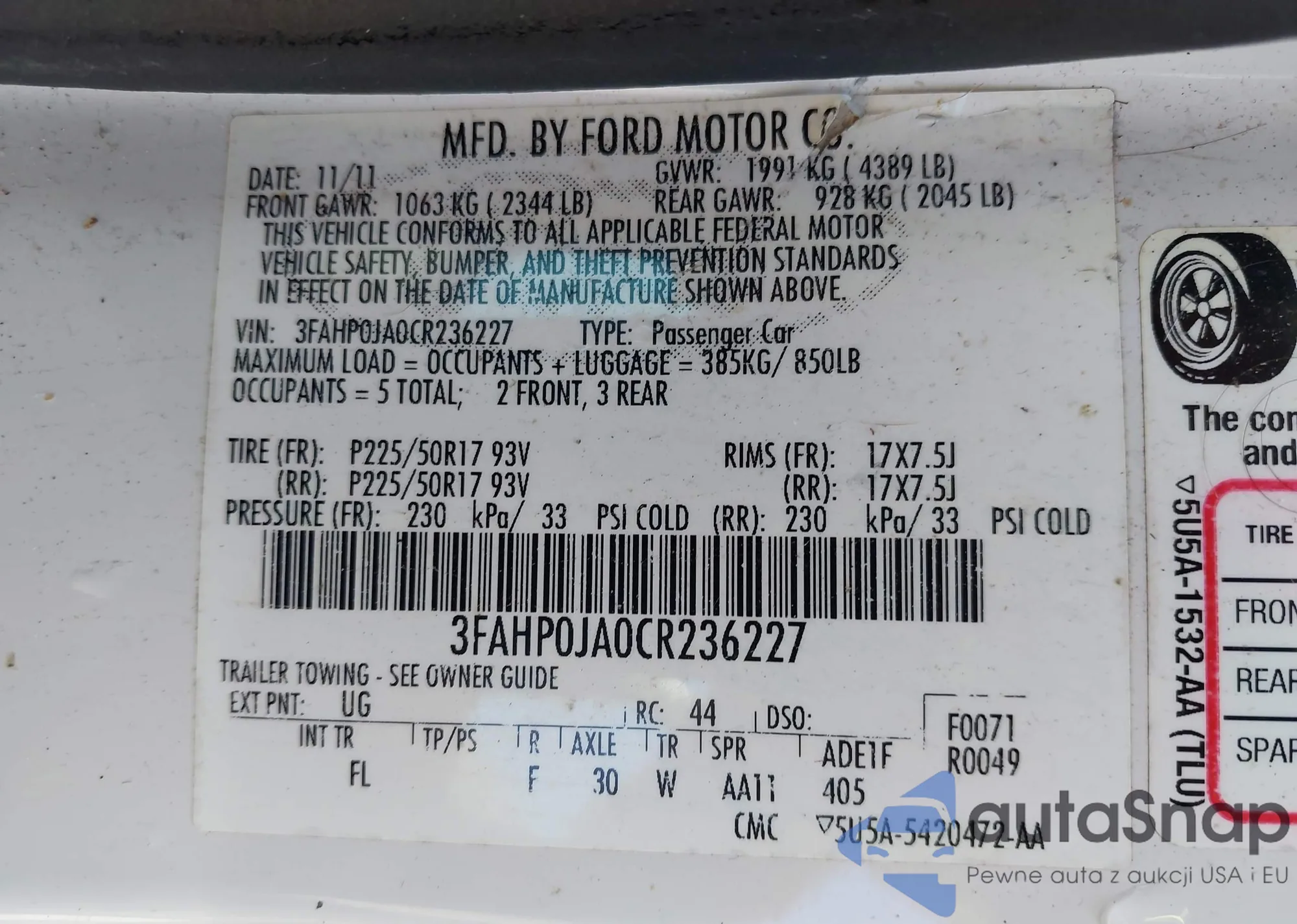 VIN: 3FAHP0JA0CR236227