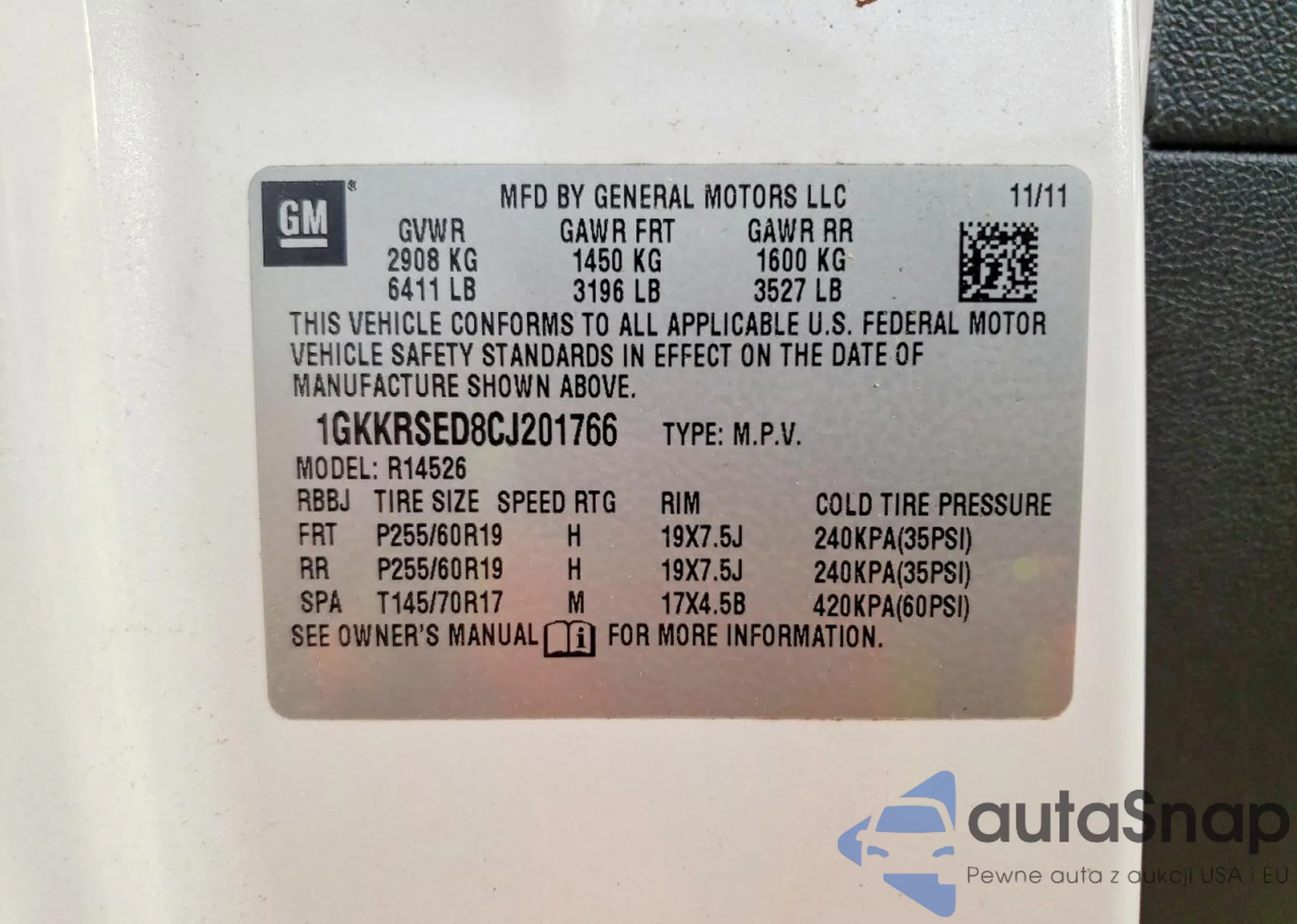VIN: 1GKKRSED8CJ201766
