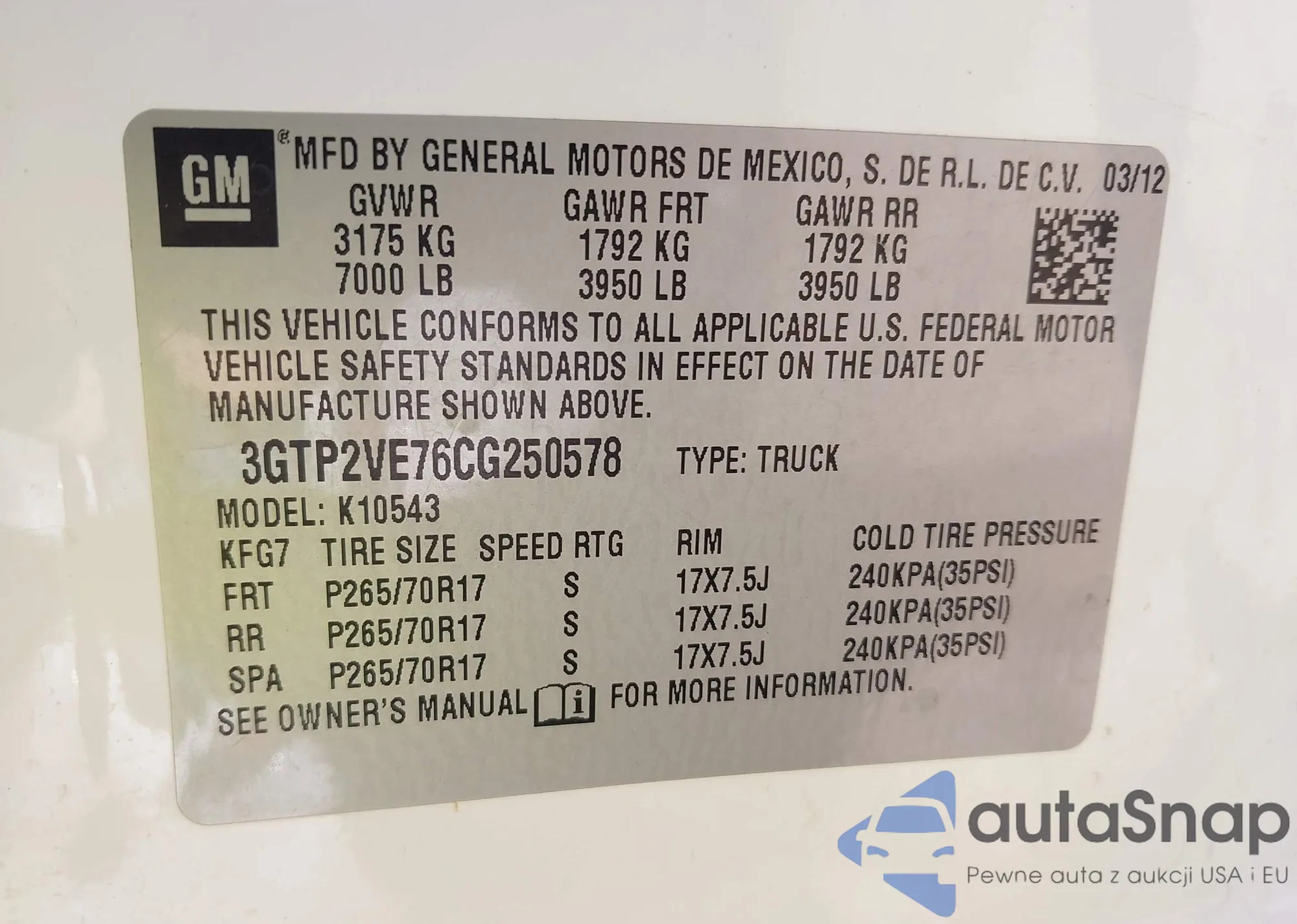 VIN: 3GTP2VE76CG250578