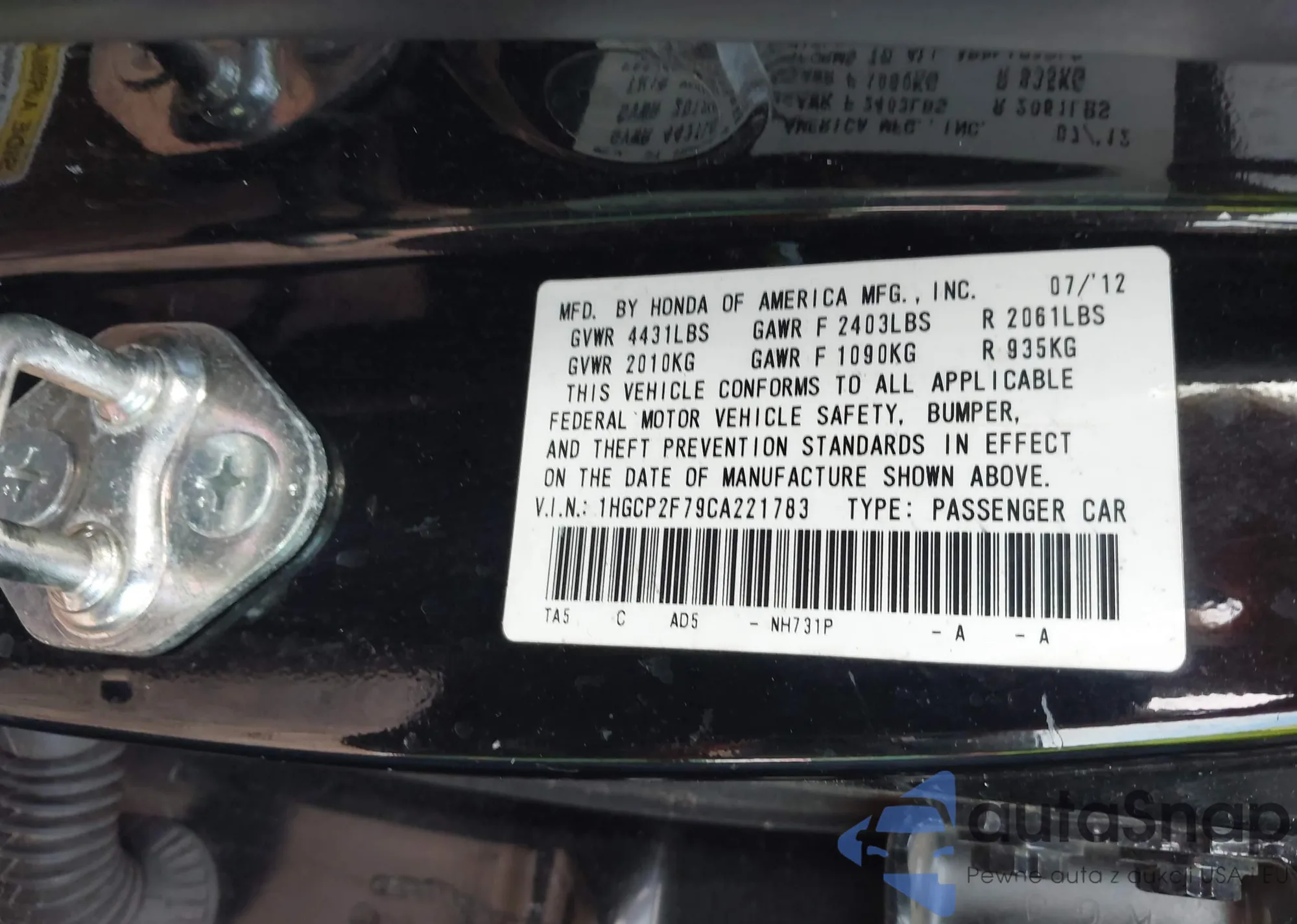VIN: 1HGCP2F79CA221783