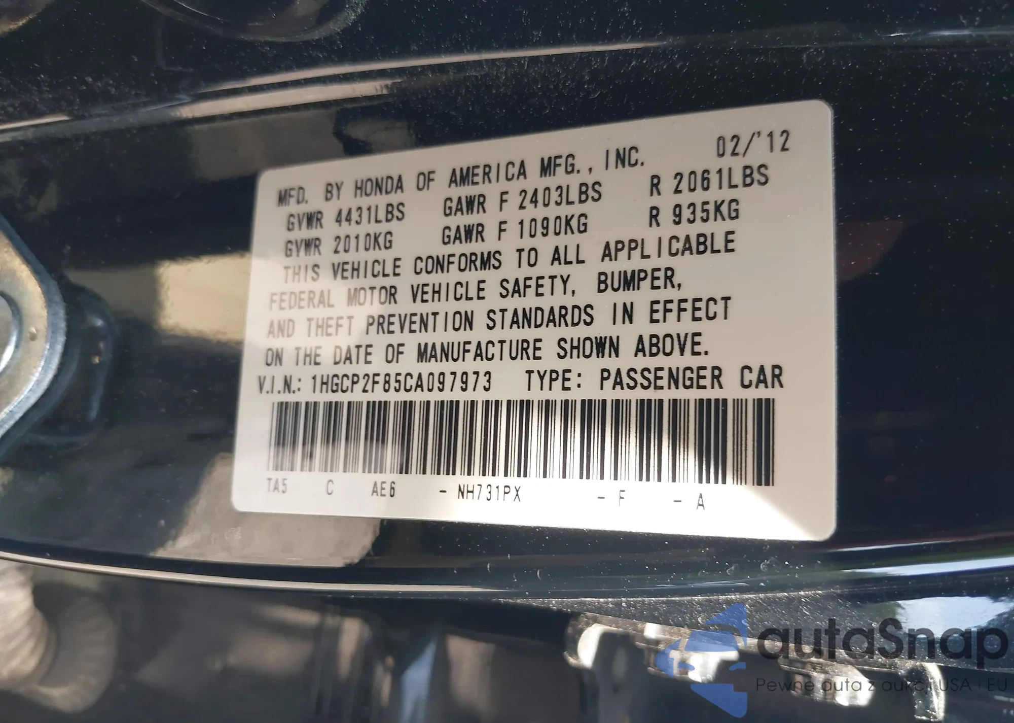 VIN: 1HGCP2F85CA097973