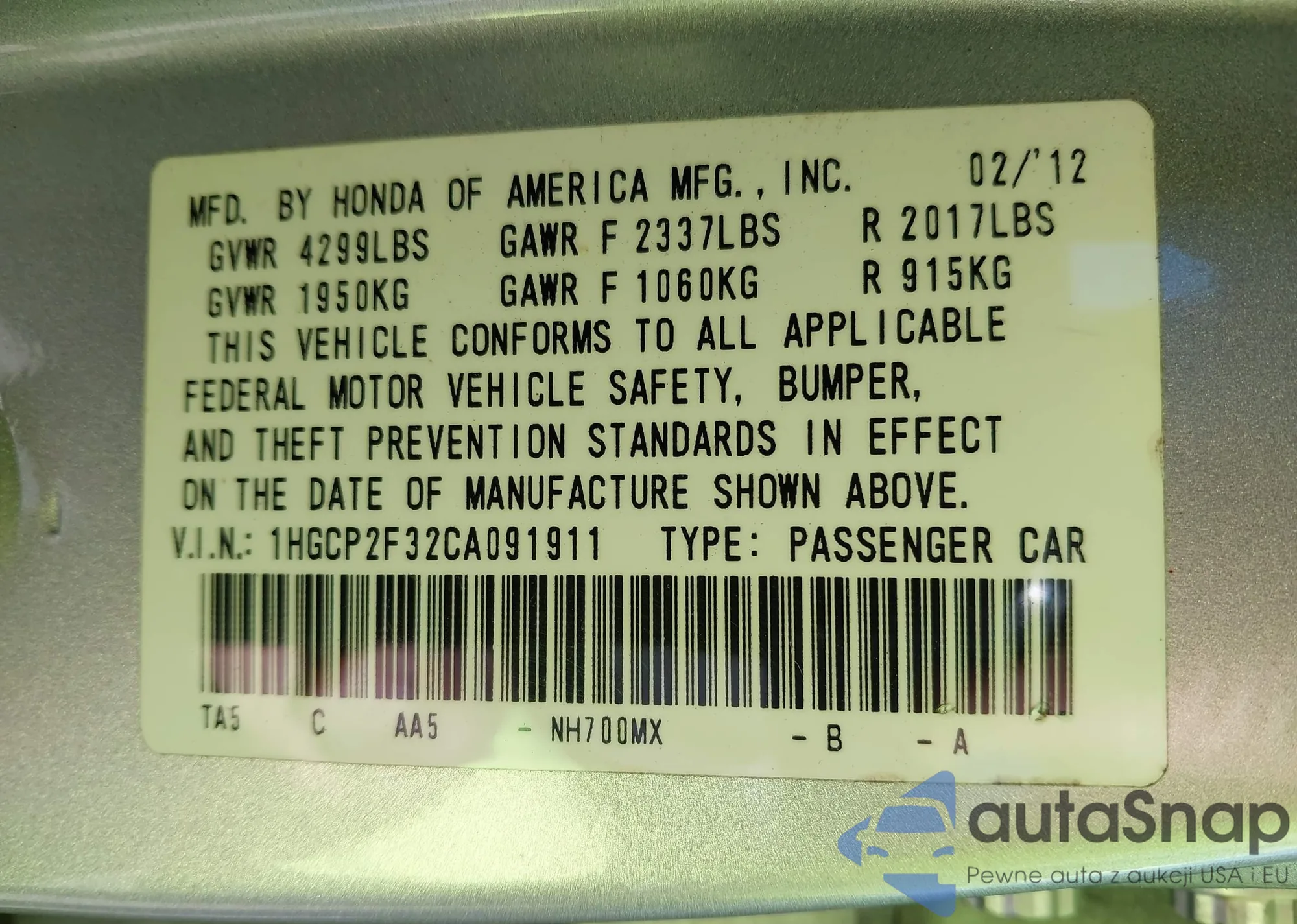 VIN: 1HGCP2F32CA091911