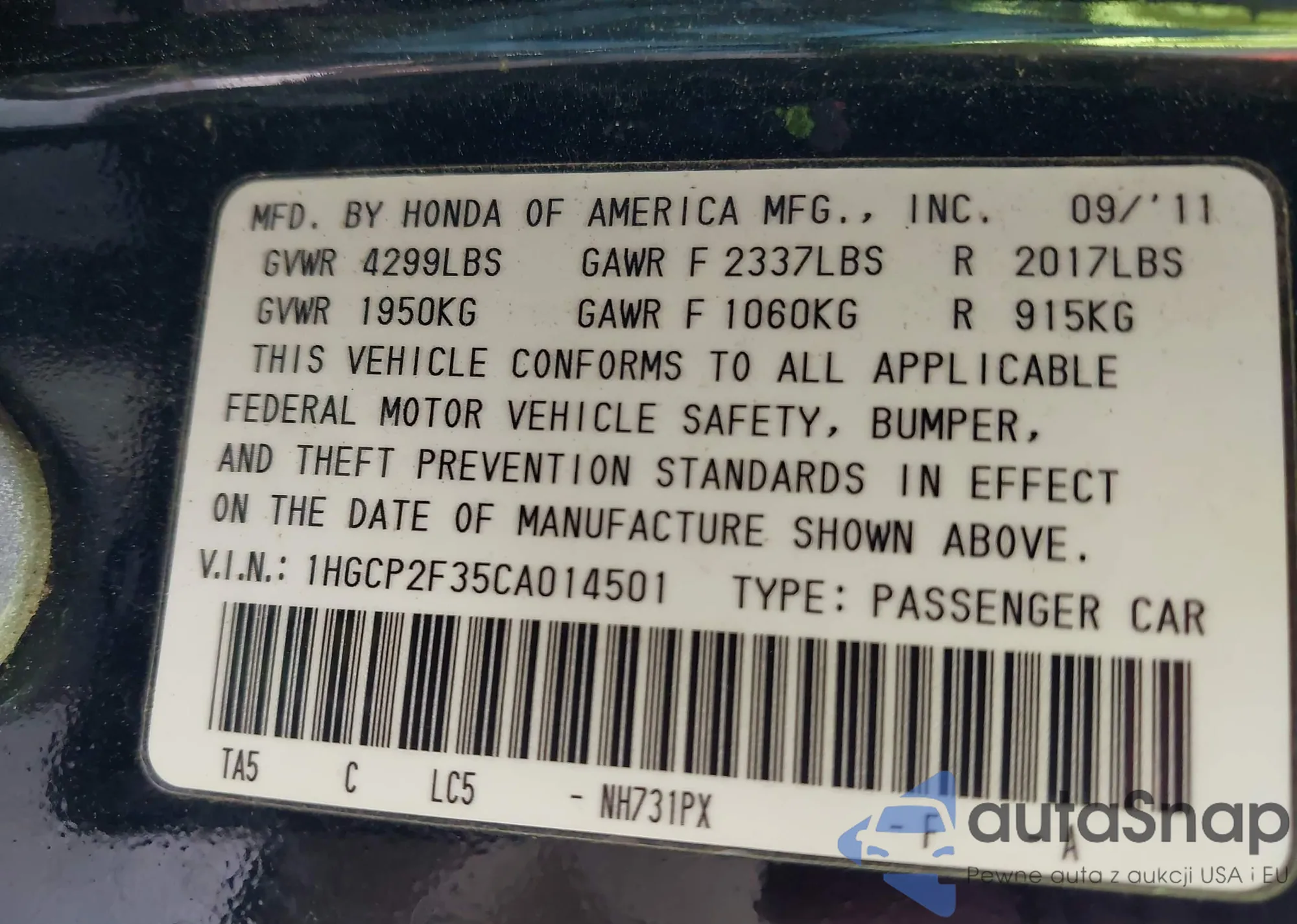 VIN: 1HGCP2F35CA014501