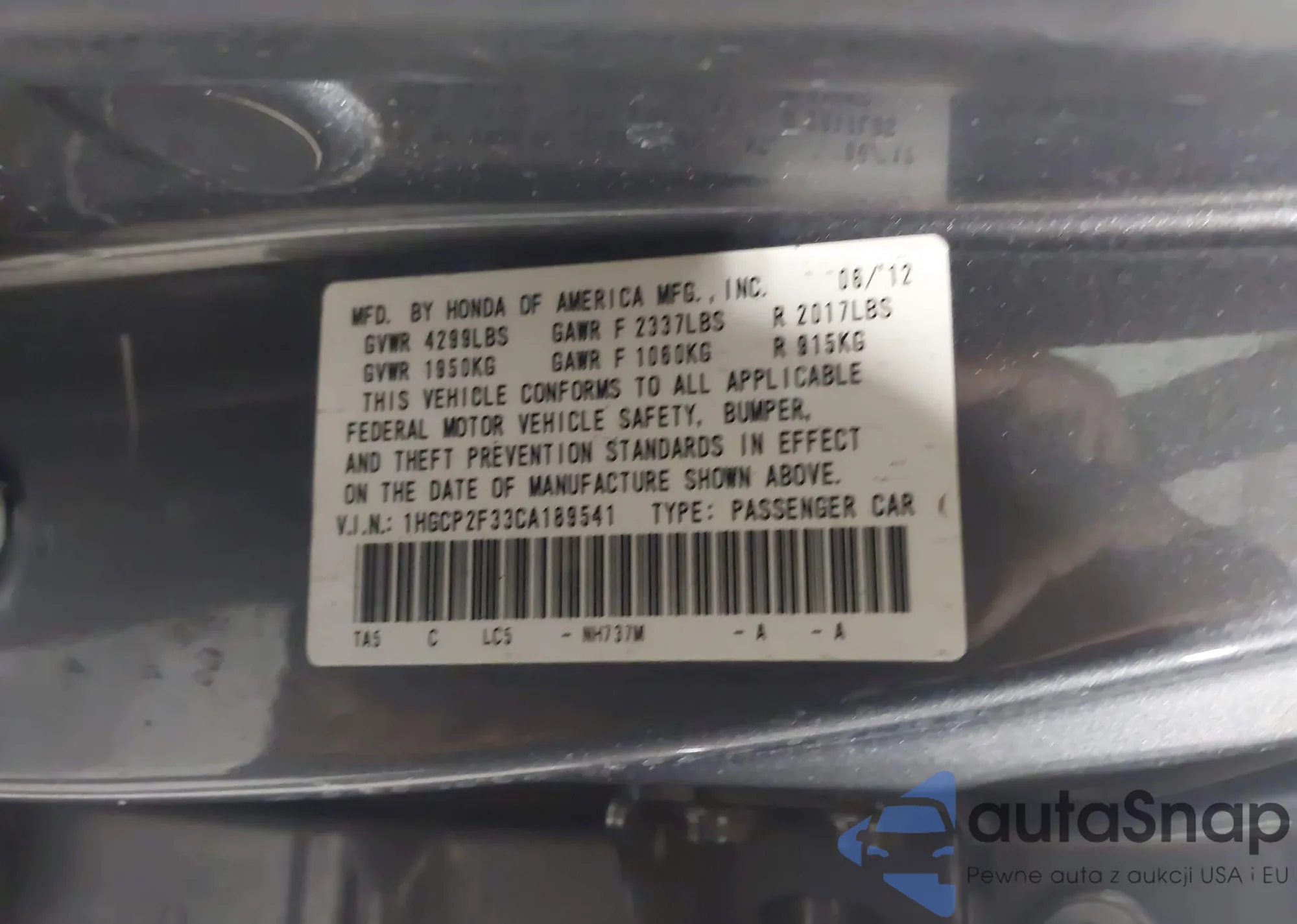 VIN: 1HGCP2F33CA189541