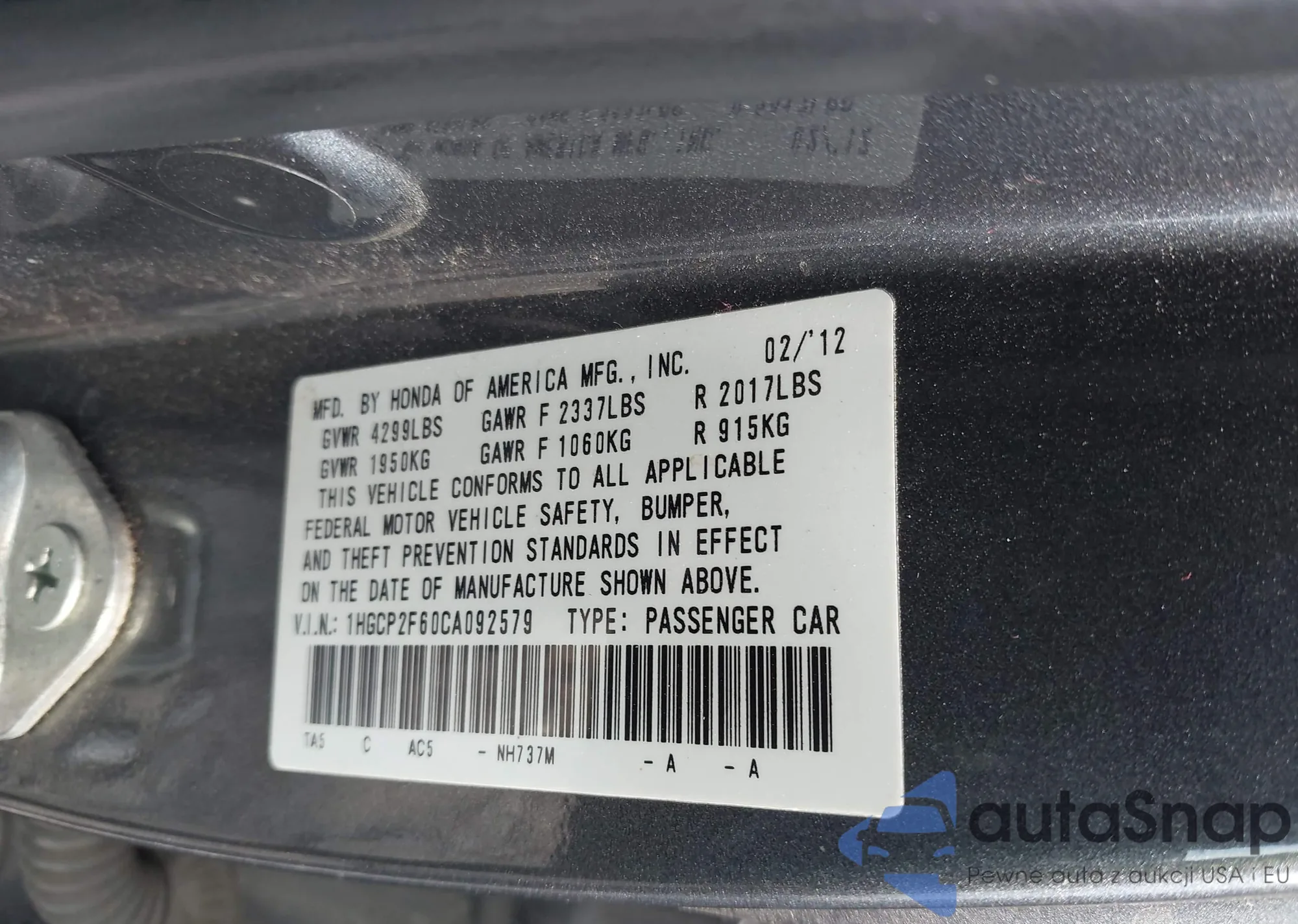 VIN: 1HGCP2F60CA092579