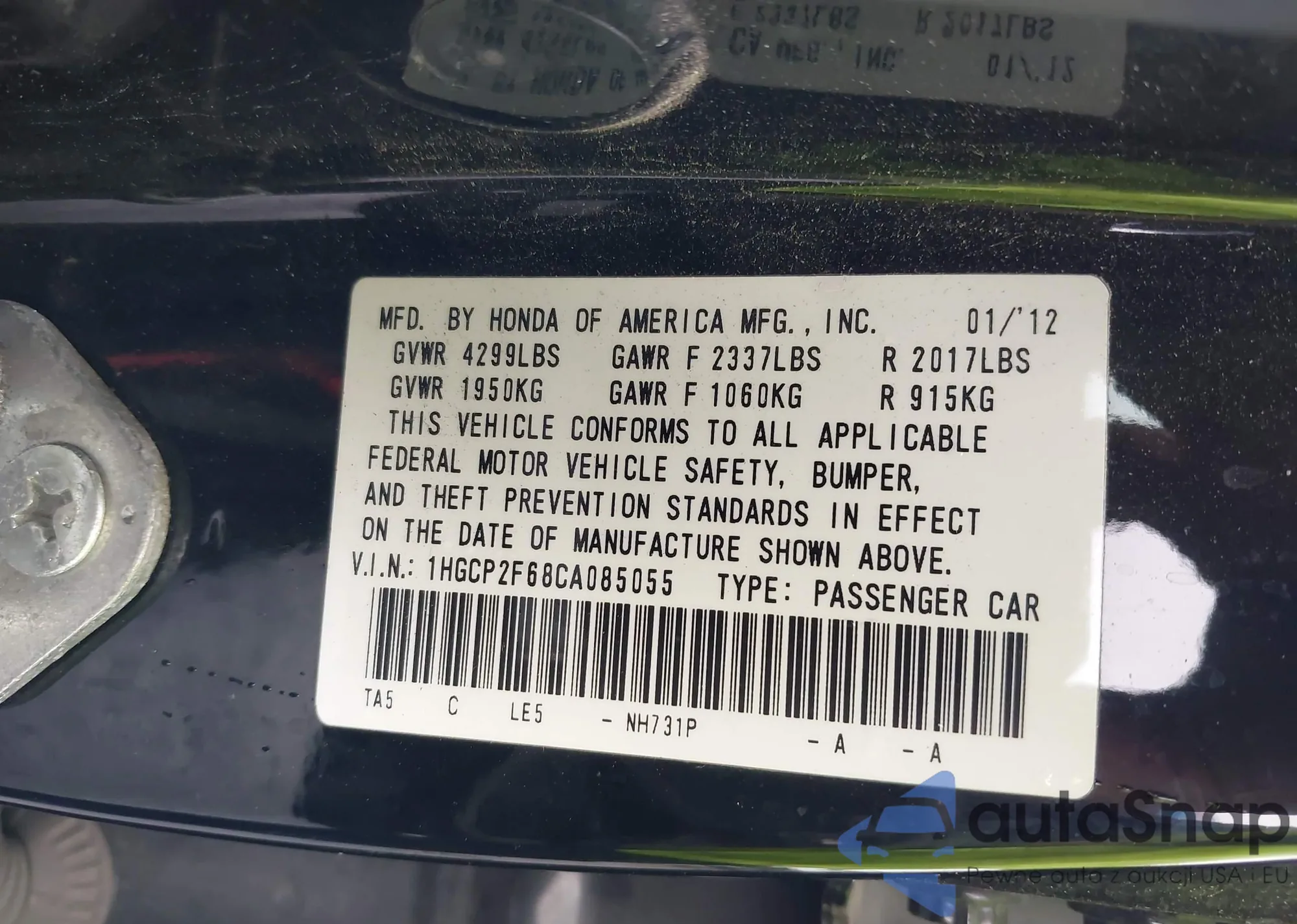 • VIN: 1HGCP2F68CA085055