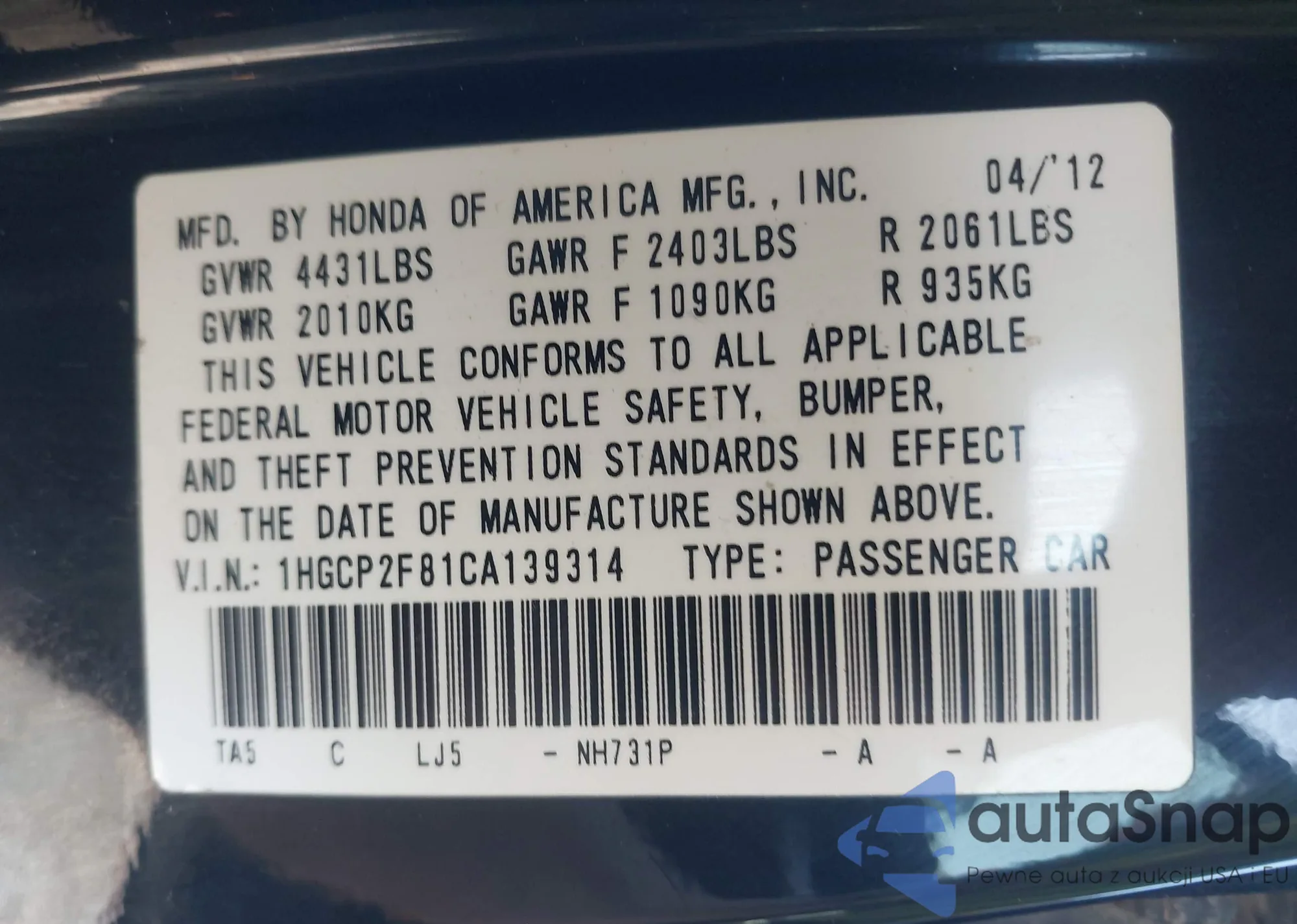 VIN: 1HGCP2F81CA139314