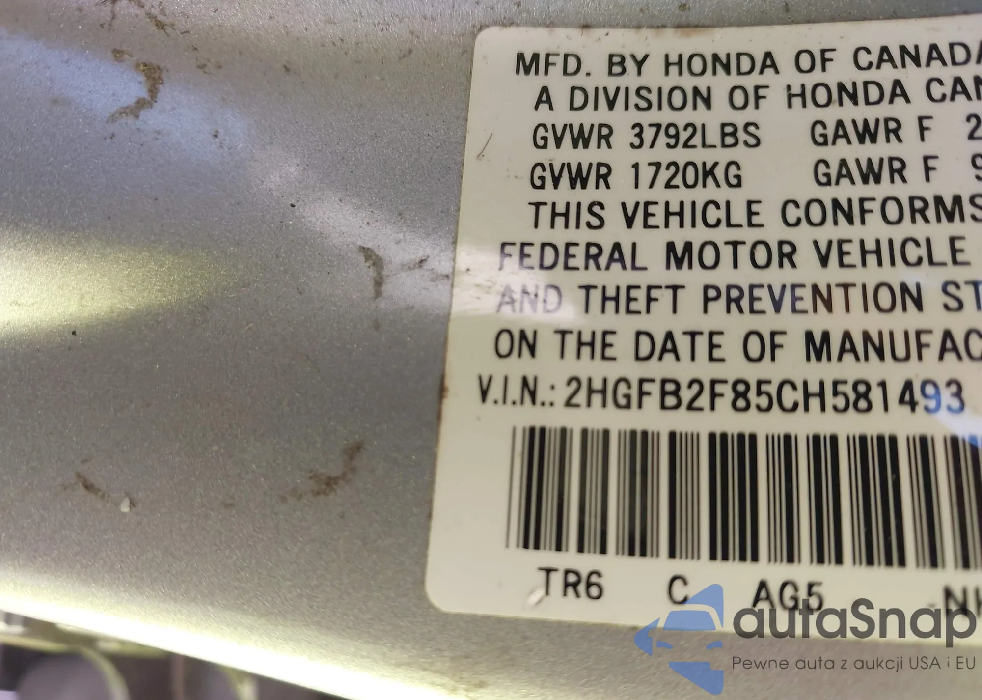 • VIN: 2HGFB2F85CH581493