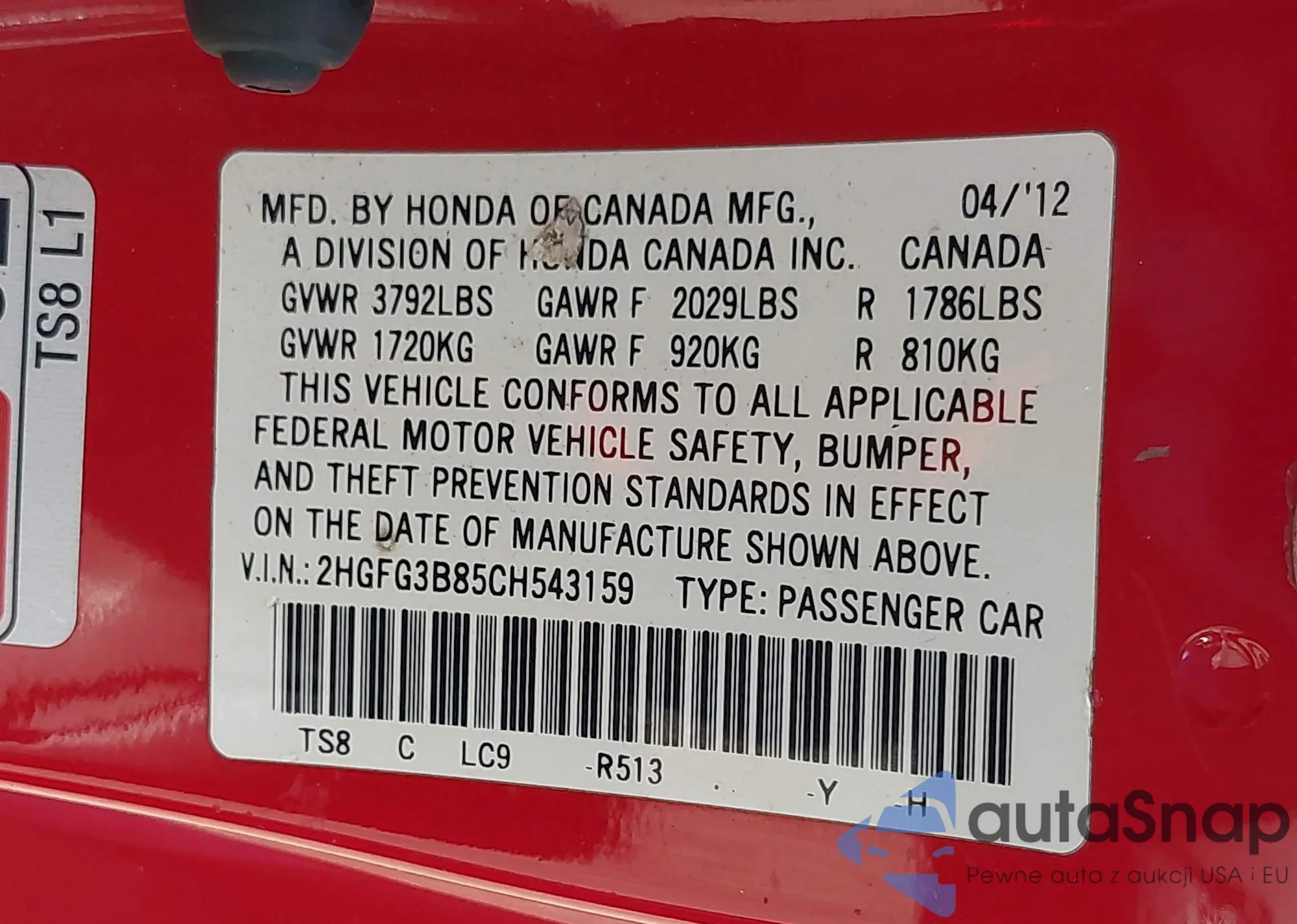 VIN: 2HGFG3B85CH543159