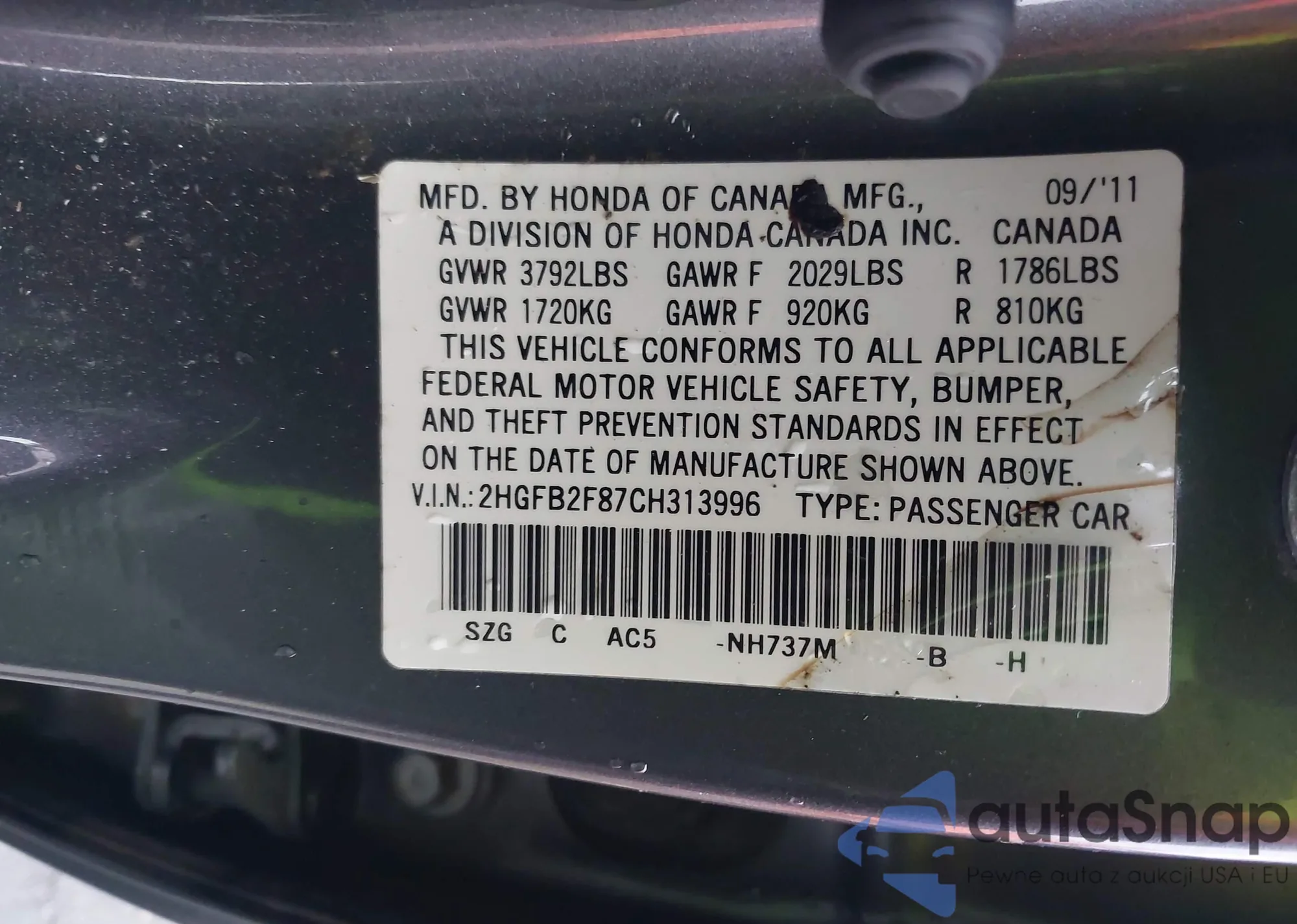 The car Honda Civic 2012 (VIN 2HGFB2F87CH313996) has already been auctioned 1 times and/or is sold by an unverified seller. We recommend checking the Carfax report and confirming registration possibilities before purchase.