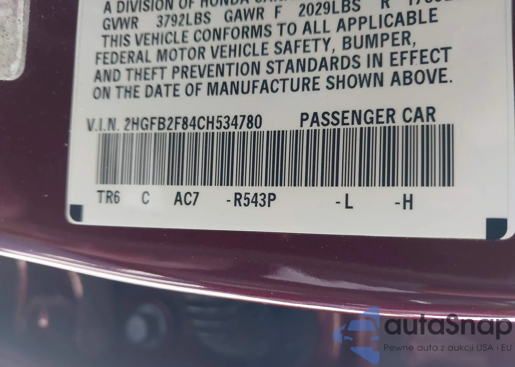 VIN: 2HGFB2F84CH534780