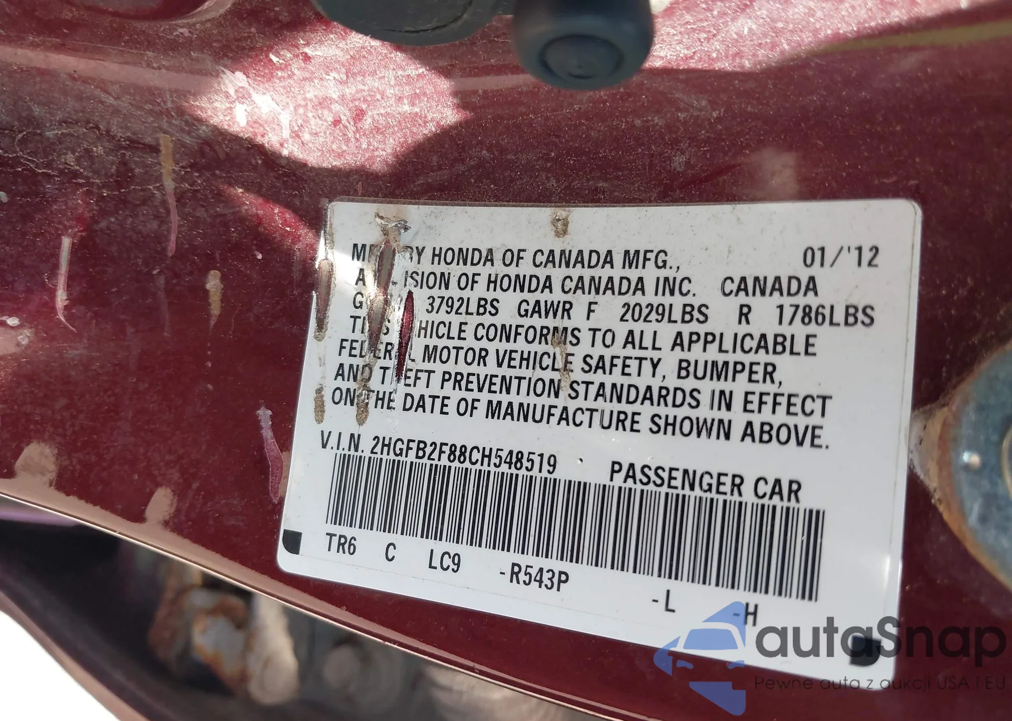 VIN: 2HGFB2F88CH548519