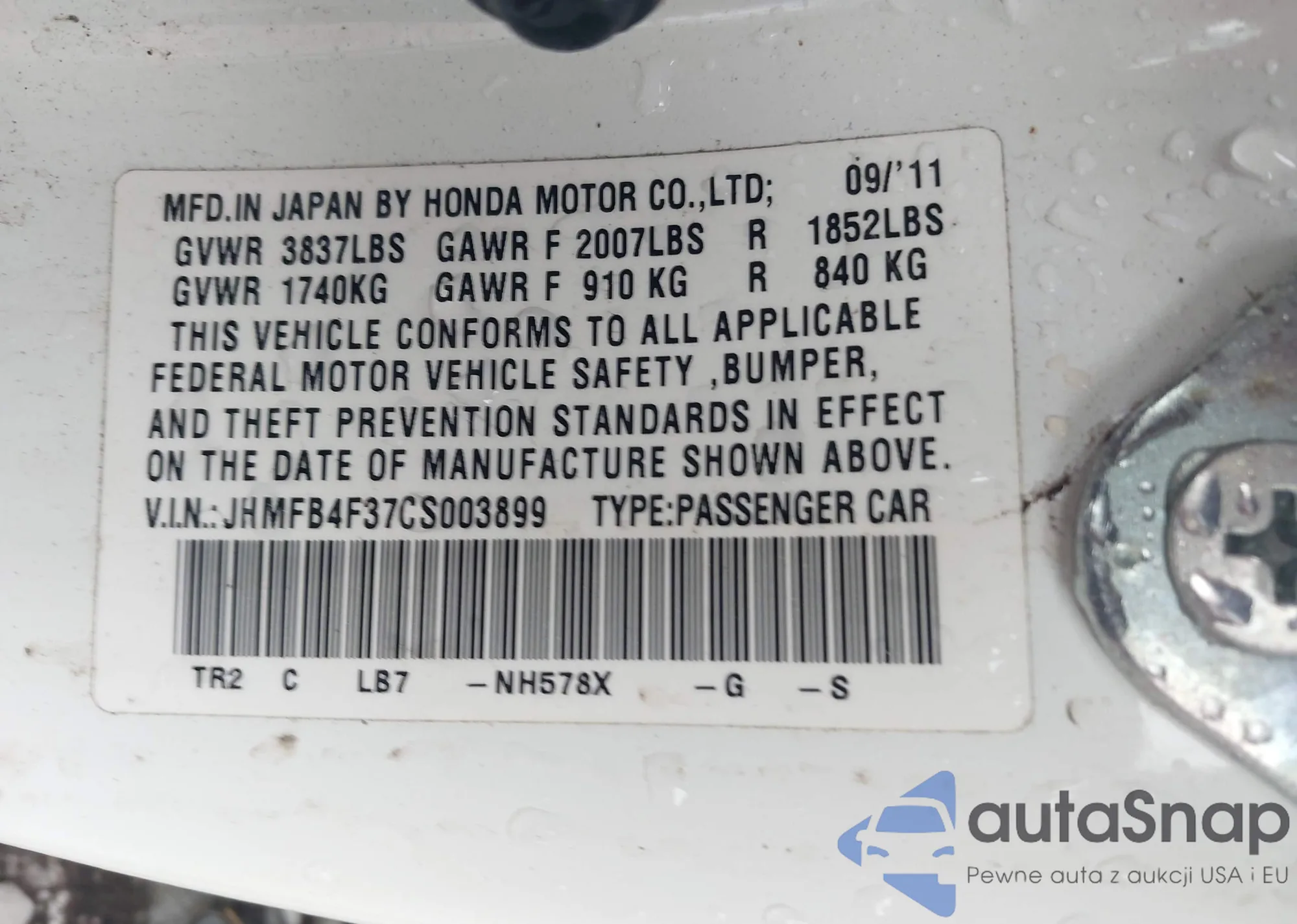 VIN: JHMFB4F37CS003899