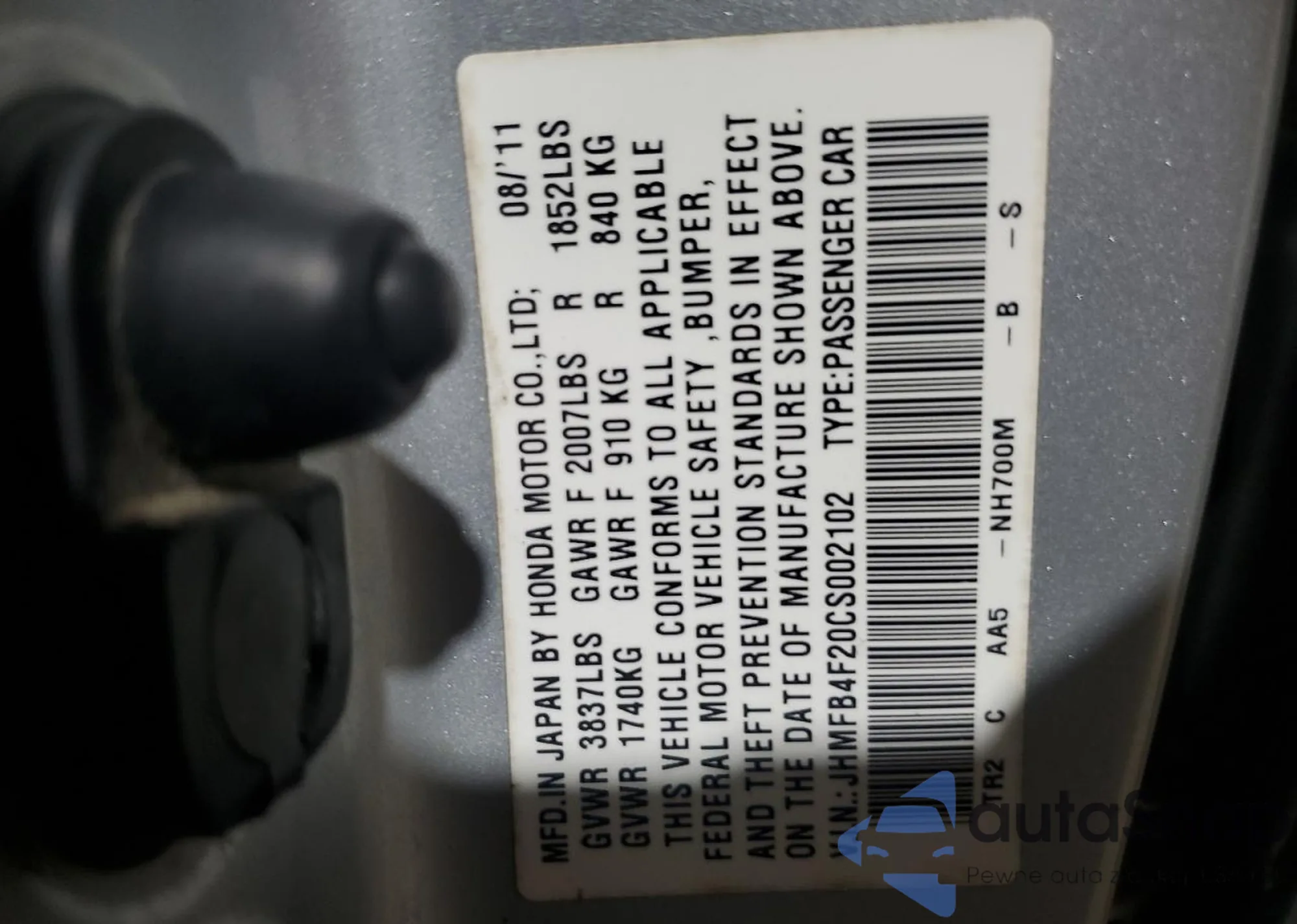 VIN: JHMFB4F20CS002102