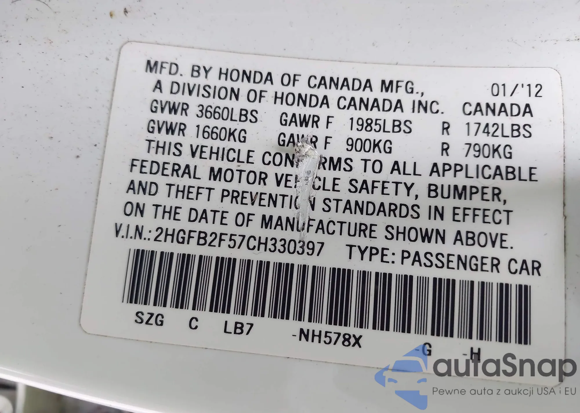 • VIN: 2HGFB2F57CH330397